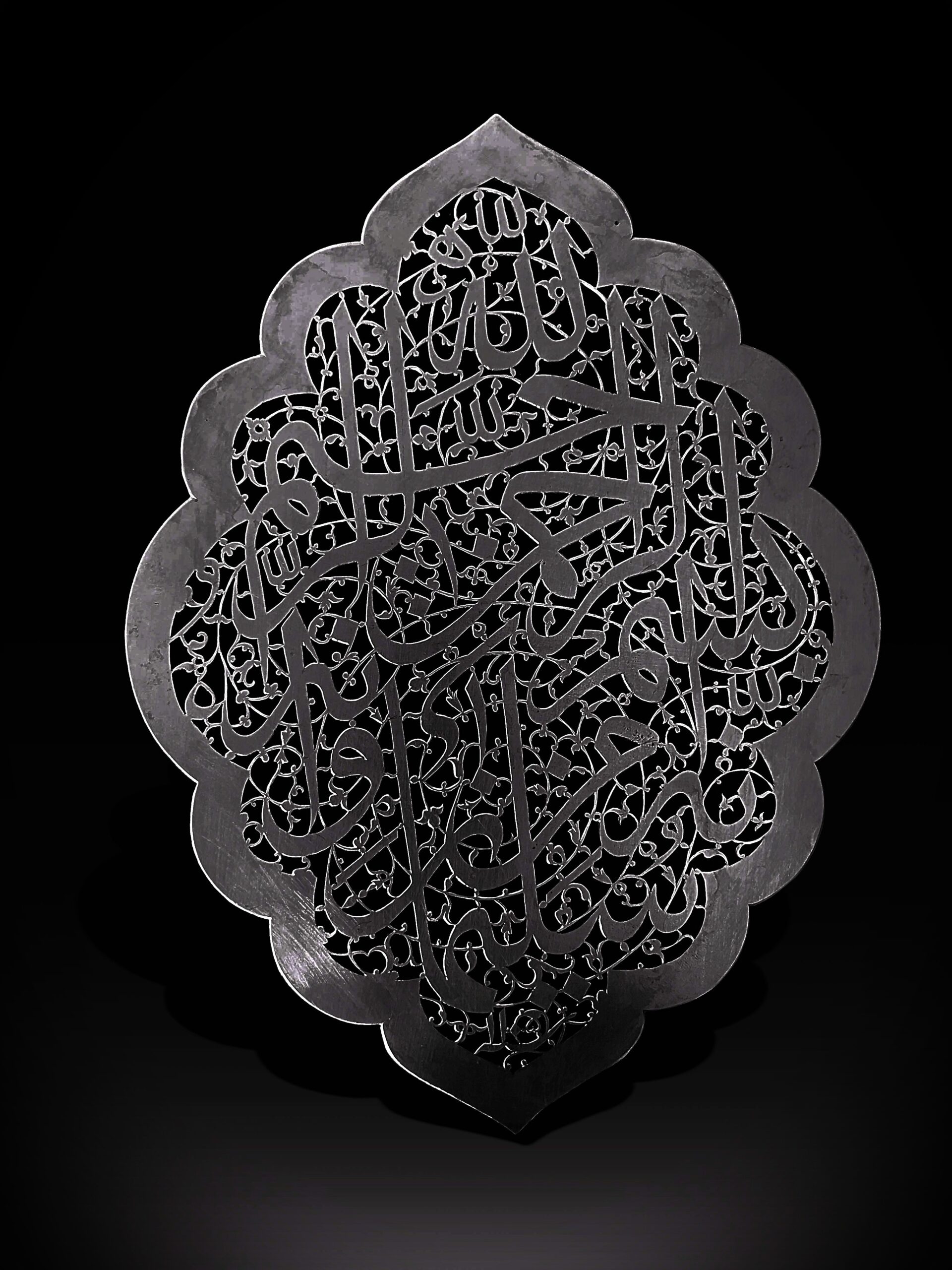 In a form of a lozenge this safavid steel Plaque, possibly made as door-fitting, made of steel; openwork decoration consisting of a “thuluth” inscription refering to the Qur’anic story of Solomon and Bilqis, Queen of Sheba, at the moment when the Queen receives Solomon’s message.