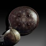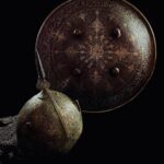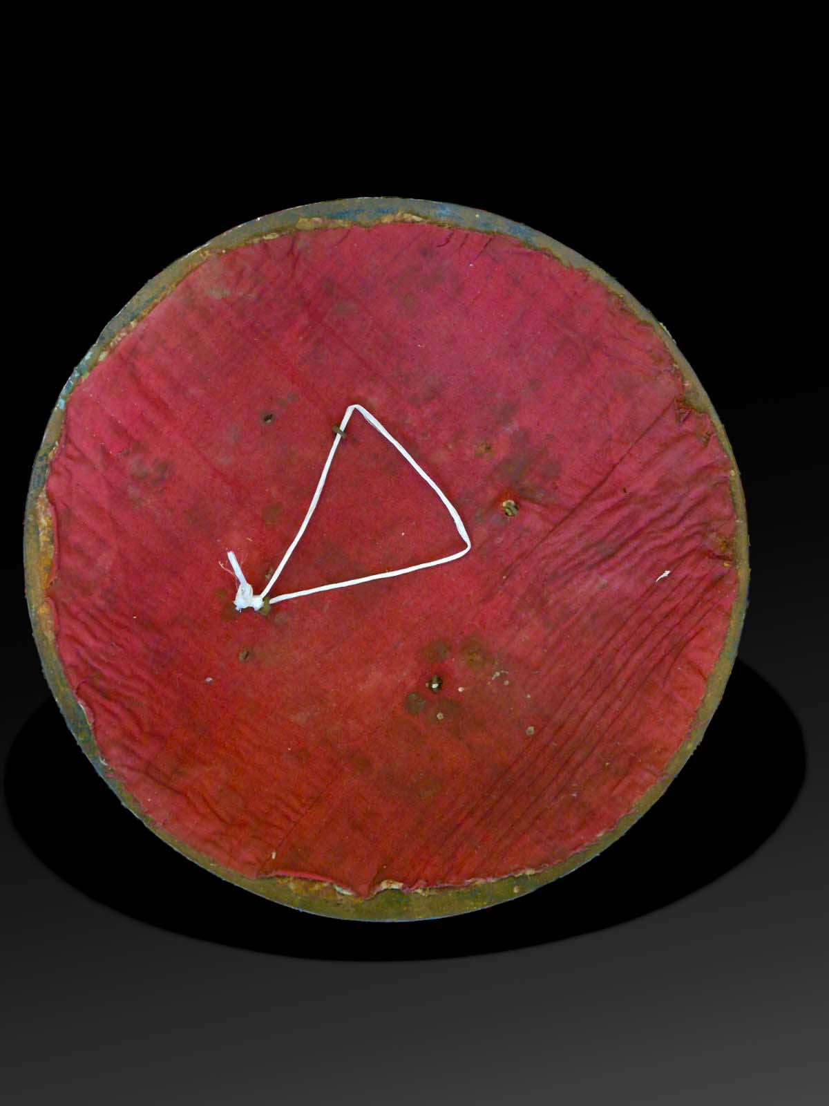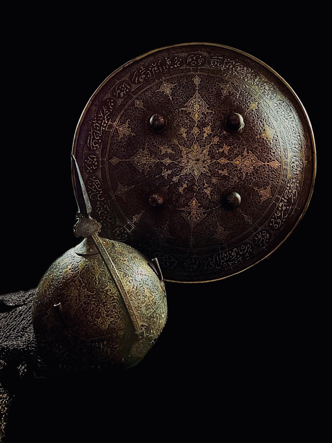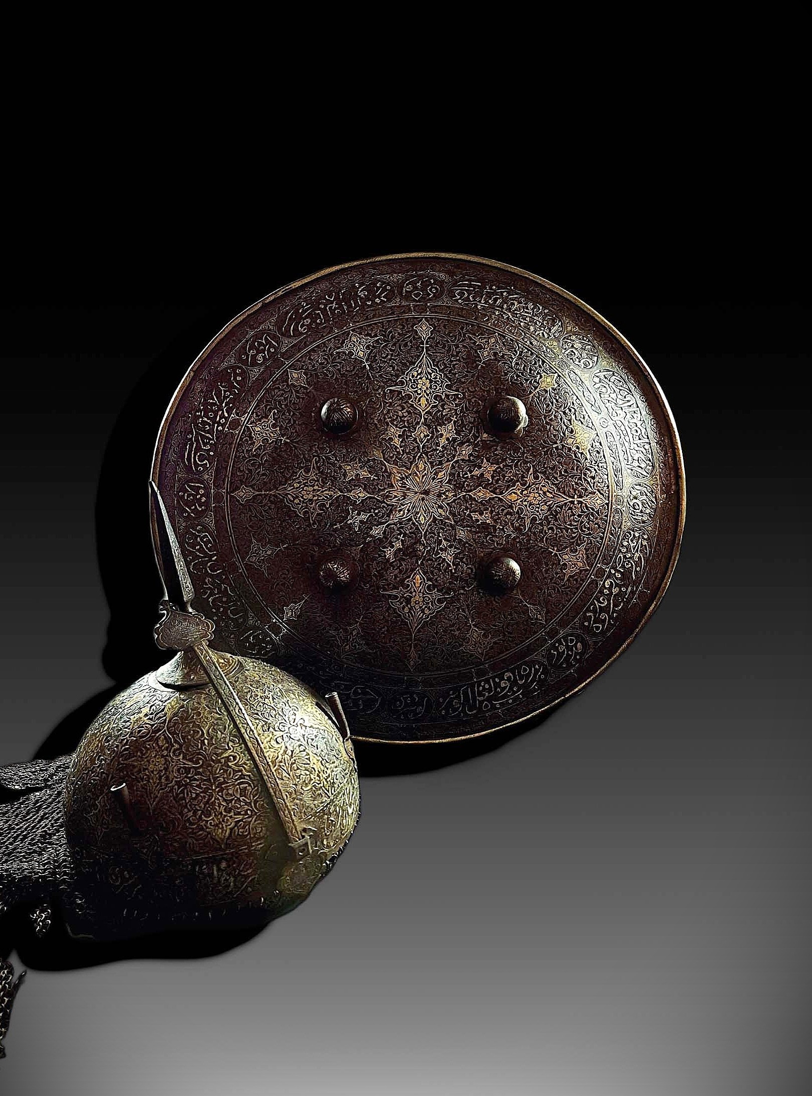 Shield: loss of gilding. Damage to cloth lining, and the shiled fabric discoloured and torn. Including some losses. Some knocks and dents around the rim. Helmet: holes in the chain mail. Rust on the interior. Some rivets on the chainmail loose. Missing some chainmail links. As Image displayed.