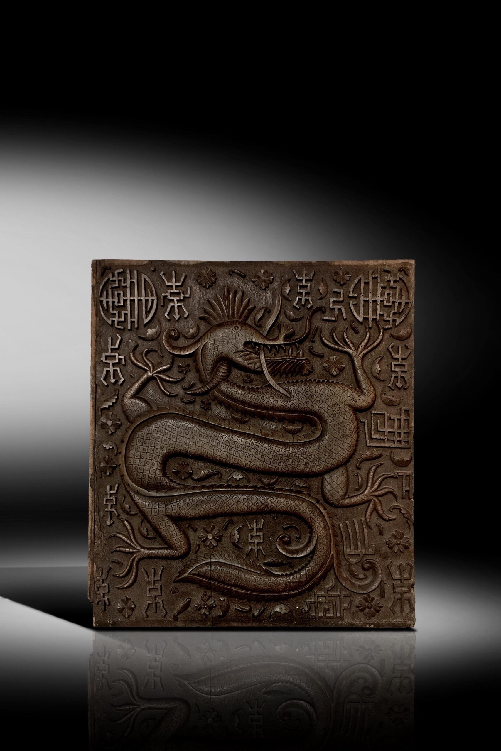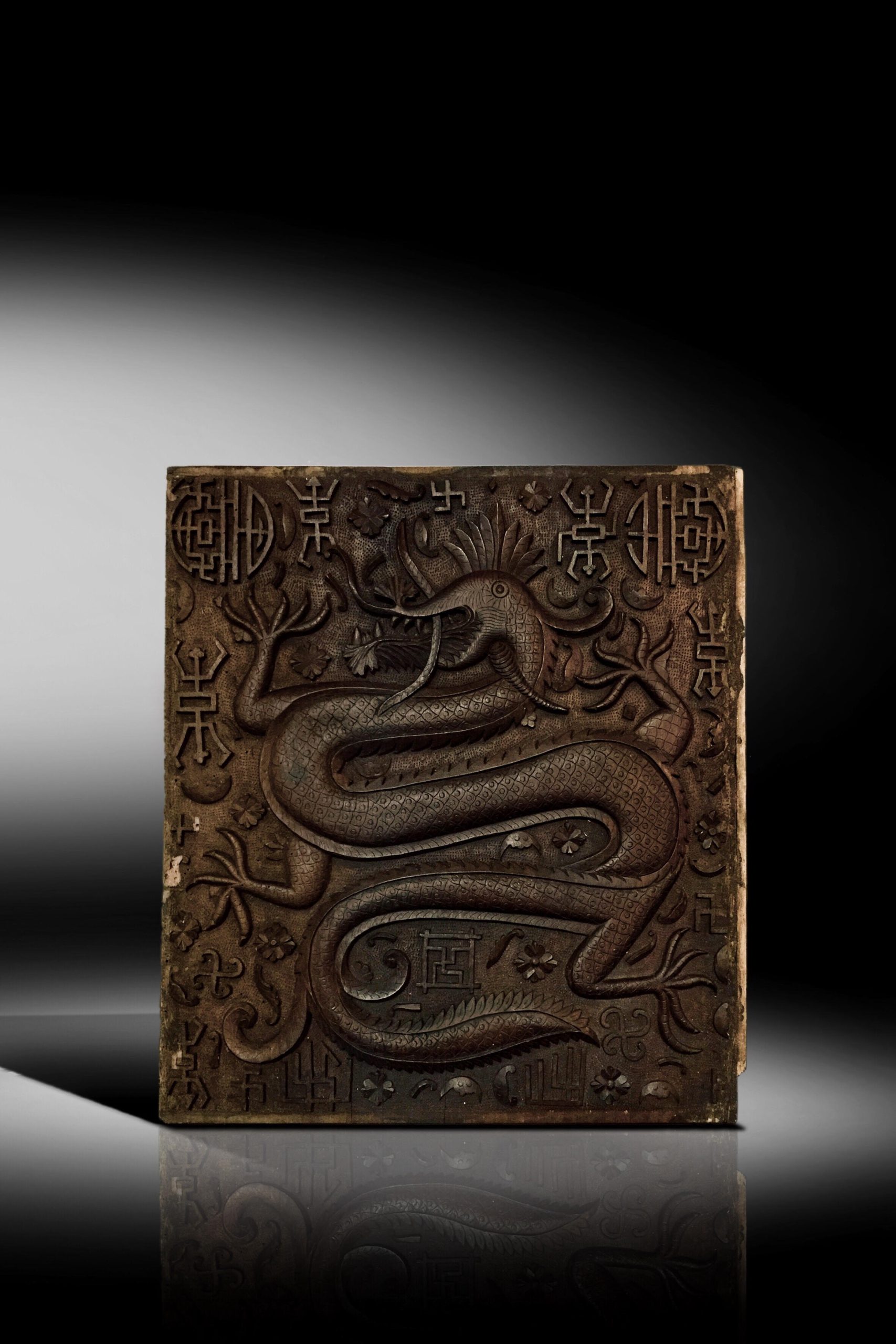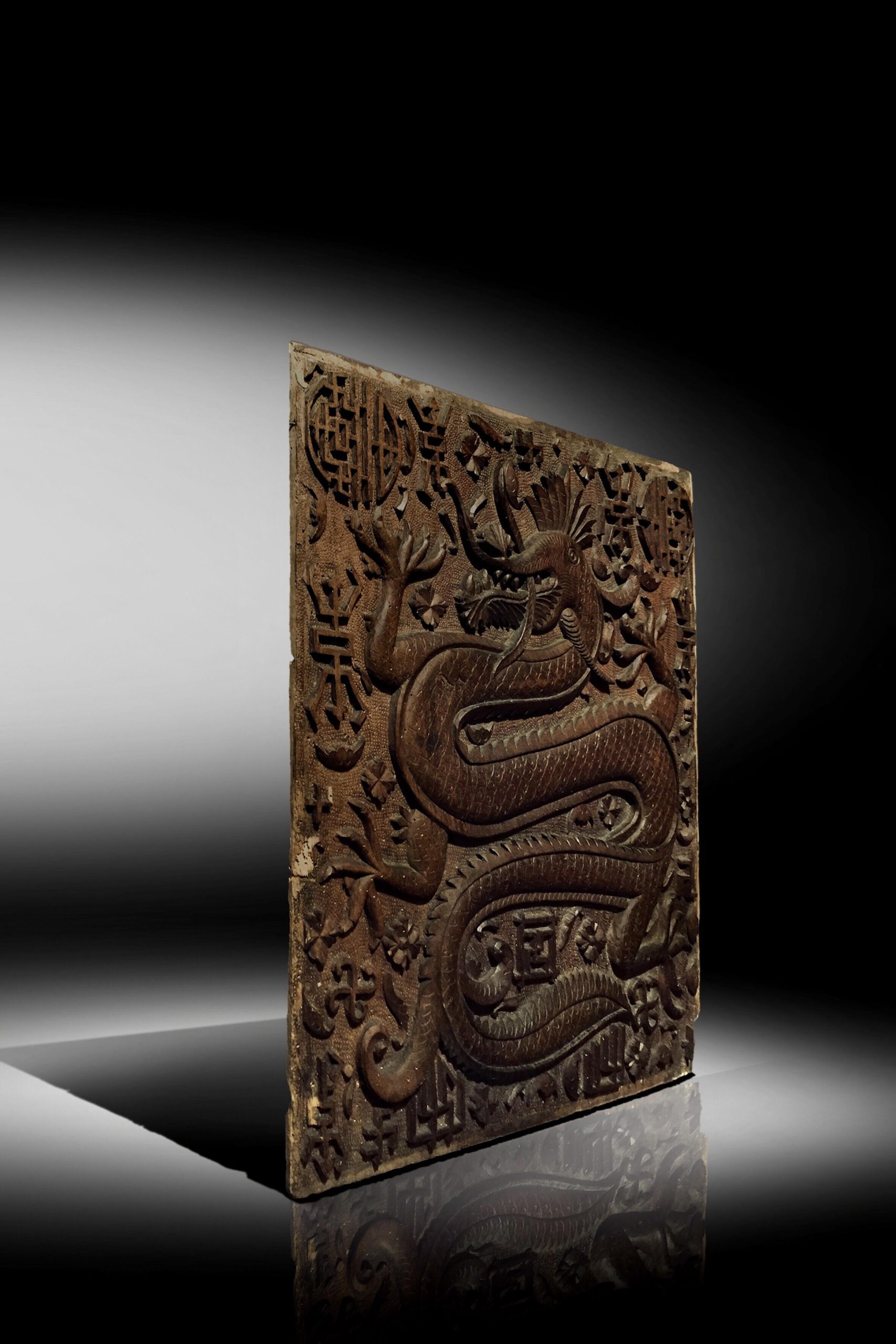 A CHINESE CARVED WOOD PANEL HUNANGHUALI ‘DRAGON’ DOUBLE-SIDED CHARACTERS