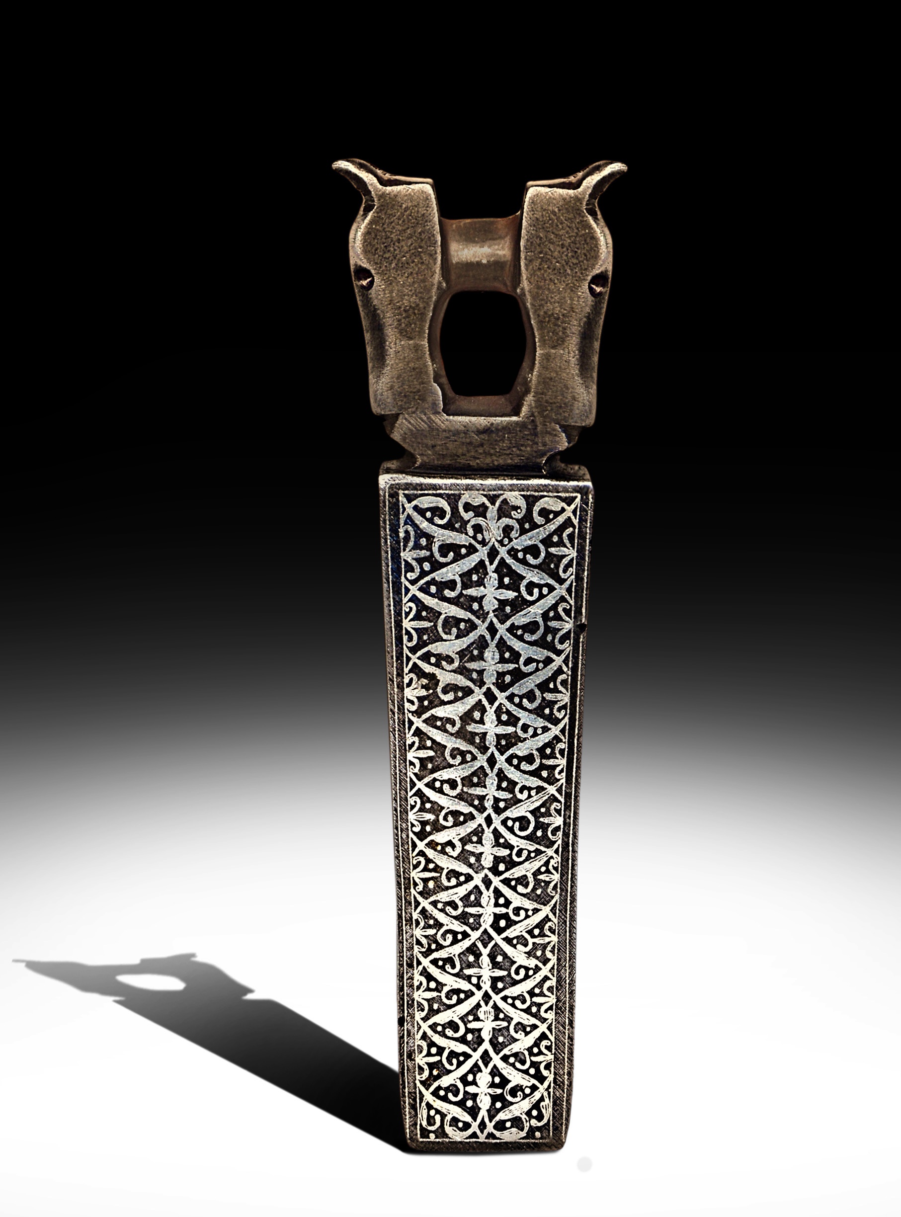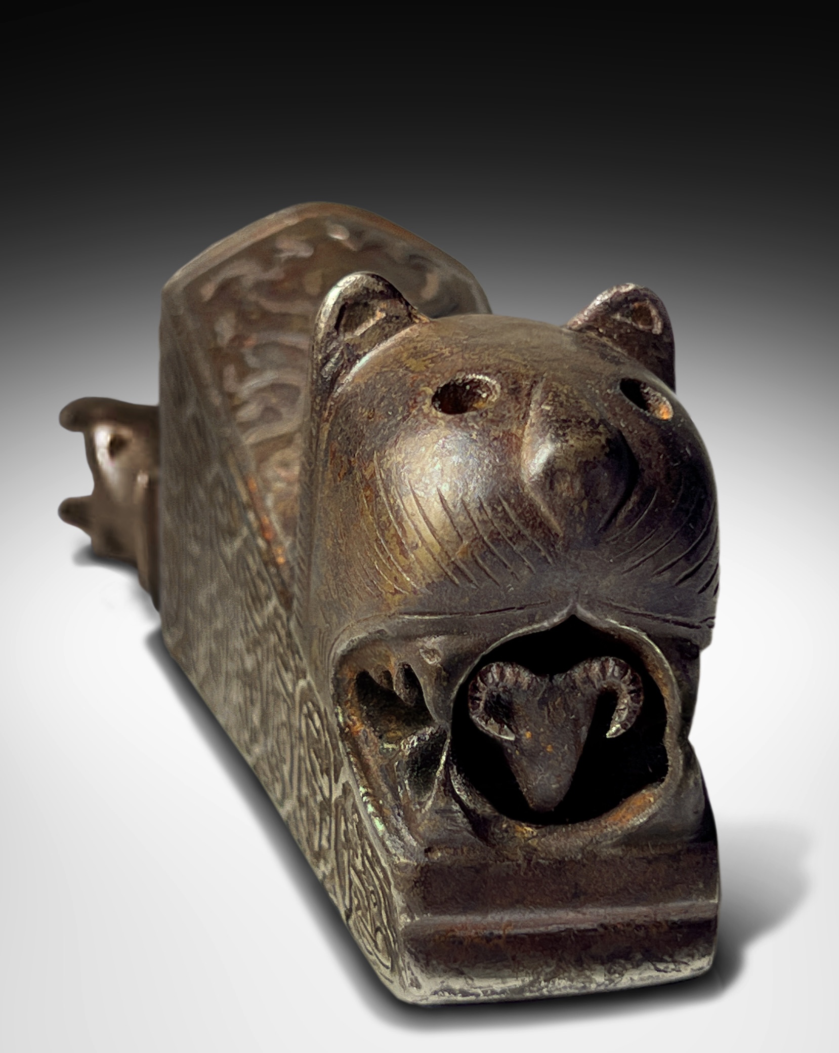Of rectangular form with a stylized lion’s head finial, its mouth opens revealing a ram’s head inside, hinge composed of two stylized horse- heads, a panel of silver inlay arabesque decoration underneath, two sides with engraved nasta’liqinscriptions with names of Shi’a Imams, top with central ridge with engraved floral spray design, rubbed.