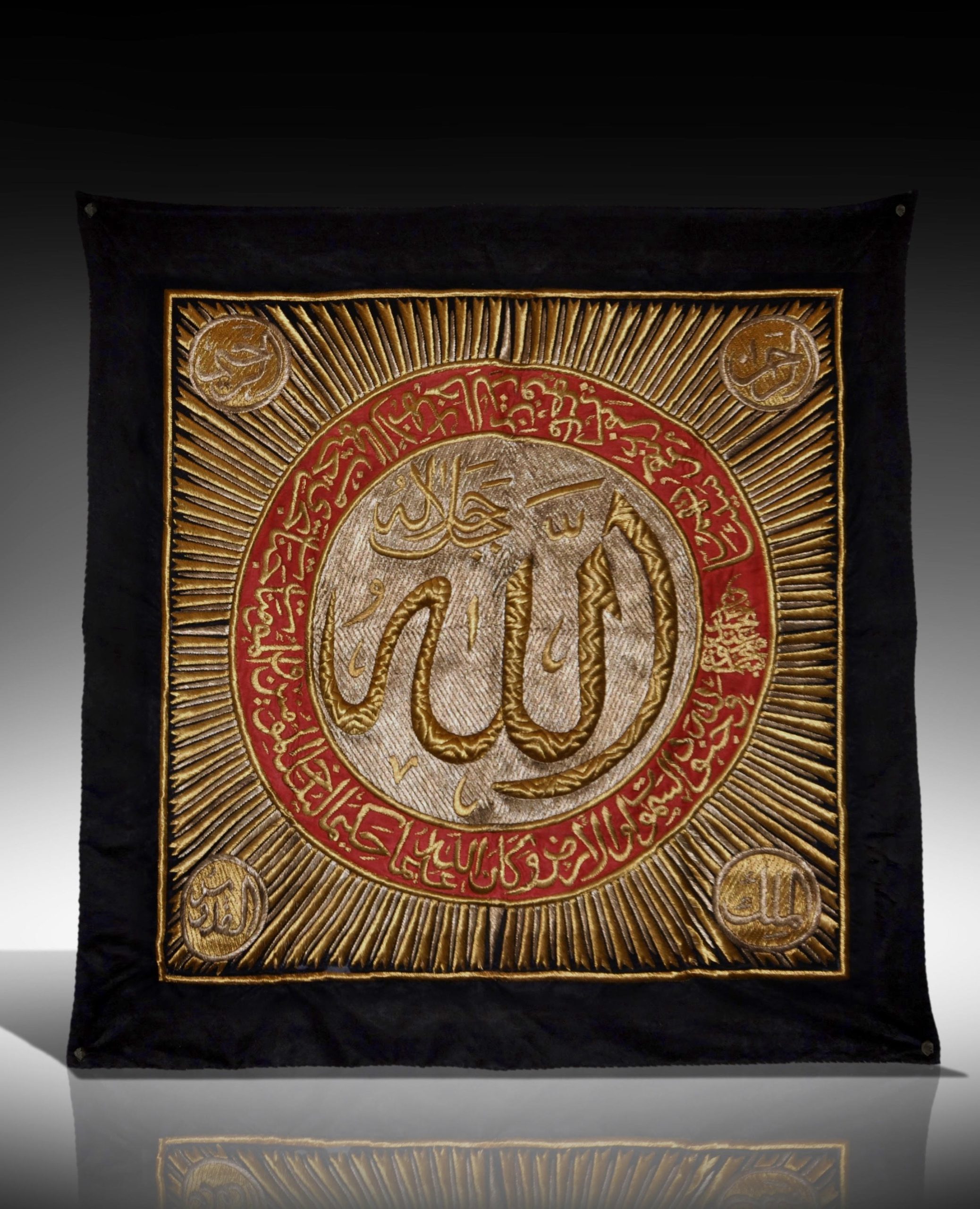 DESCRIPTION:Of square form, In an Arabic -Burst Sun-form cresting emitting rays in the centre the name of “ALLAH” with the rich gold embroidered on black silk within the radial composition and the spandrels of gold silk with gold rays between black bands.