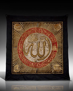 The inscription In the centre is the name of “ALLAH” made with the rich gold embroidered on black aground in the (XVIII period) in Suadi Arabia.