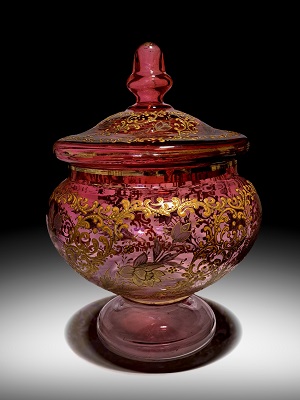 DESCRIPTION: | A LARGE GILT AND ENAMELLED PINK GLASS-LIDDED BOWLOf compressed globular shape, resting on a gently splayed foot, rising to narrow shoulders and a straight, cylindrical neck, covered by a compressed dome-shaped lid with a rounded pommel at the top, the exterior decorated with Western-inspired yellow enamelled and gilt vegetal volutes encasing delicate gold-painted rose stems, the colour of the glass transitioning from transparent to hot pink from the bottom to the top. |