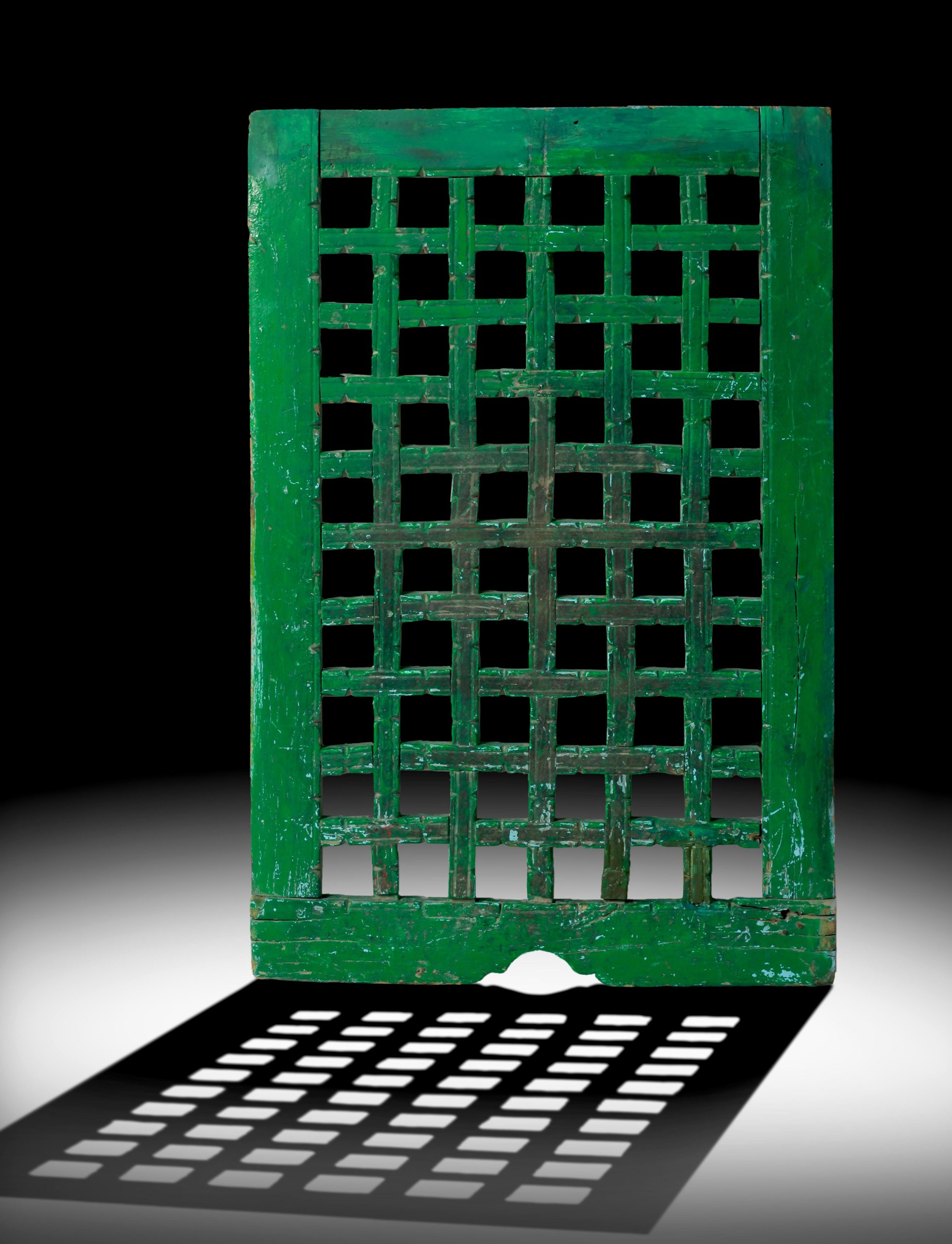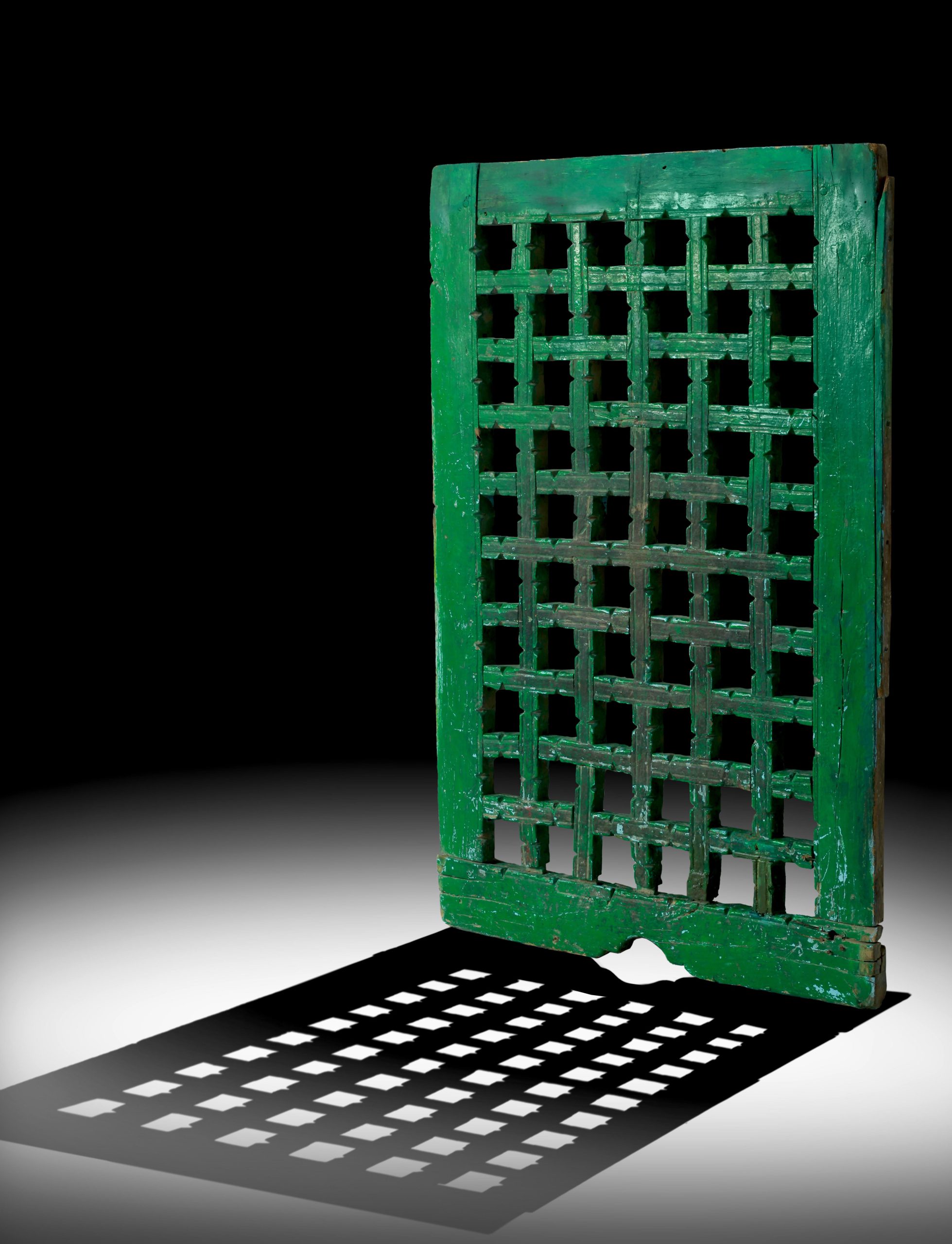 DESCRIPTION: | Exemplify the Forth sided, the wooden base set with carved openwork plaques designed with interlinking geometric forth star squares, with the below half gape shape handle.This type of panel is used and put together in the Nassird period for the narrow street traders and at the same time, the designed openwork lets the air pilgrimage through the star shape of the panel openwork. |