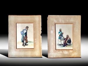 DESCRIPTION: | First Painting (watercolour). The painting depicts a beggar walking toward the right and gaping at the veneer of the page, leaning on a copper with his shoulder lowered. He wears a long, tattered light blue robe, and a worn-out brownish coat with coat lining and fringe. The sole of both shoes has worn out, exposing the socks he has a full, grey beard and large hands.The second painting is a very prepared moustache youthful street barber who inclines his blade on a sharpener, as the other individual kneels down on the ground with his right-hand holding a mirror-gazing at the sleek bundles of hairstyle on his crown centre. |