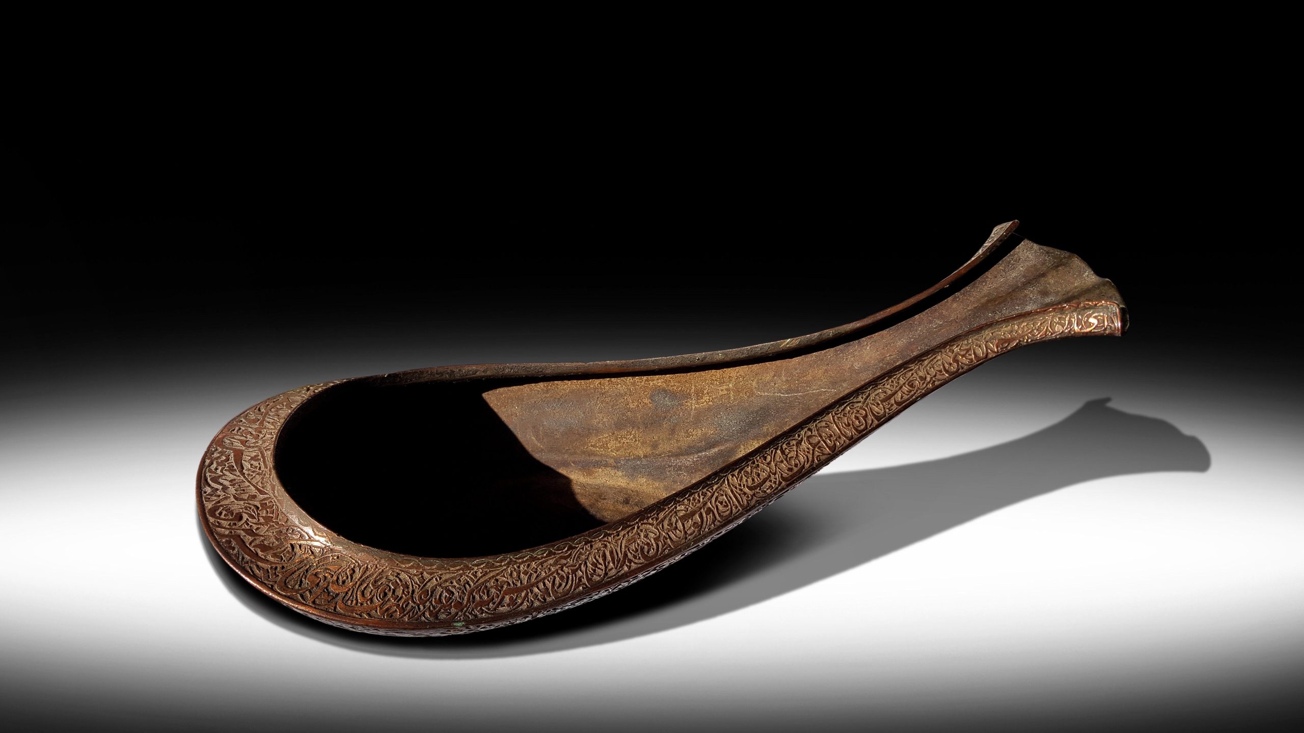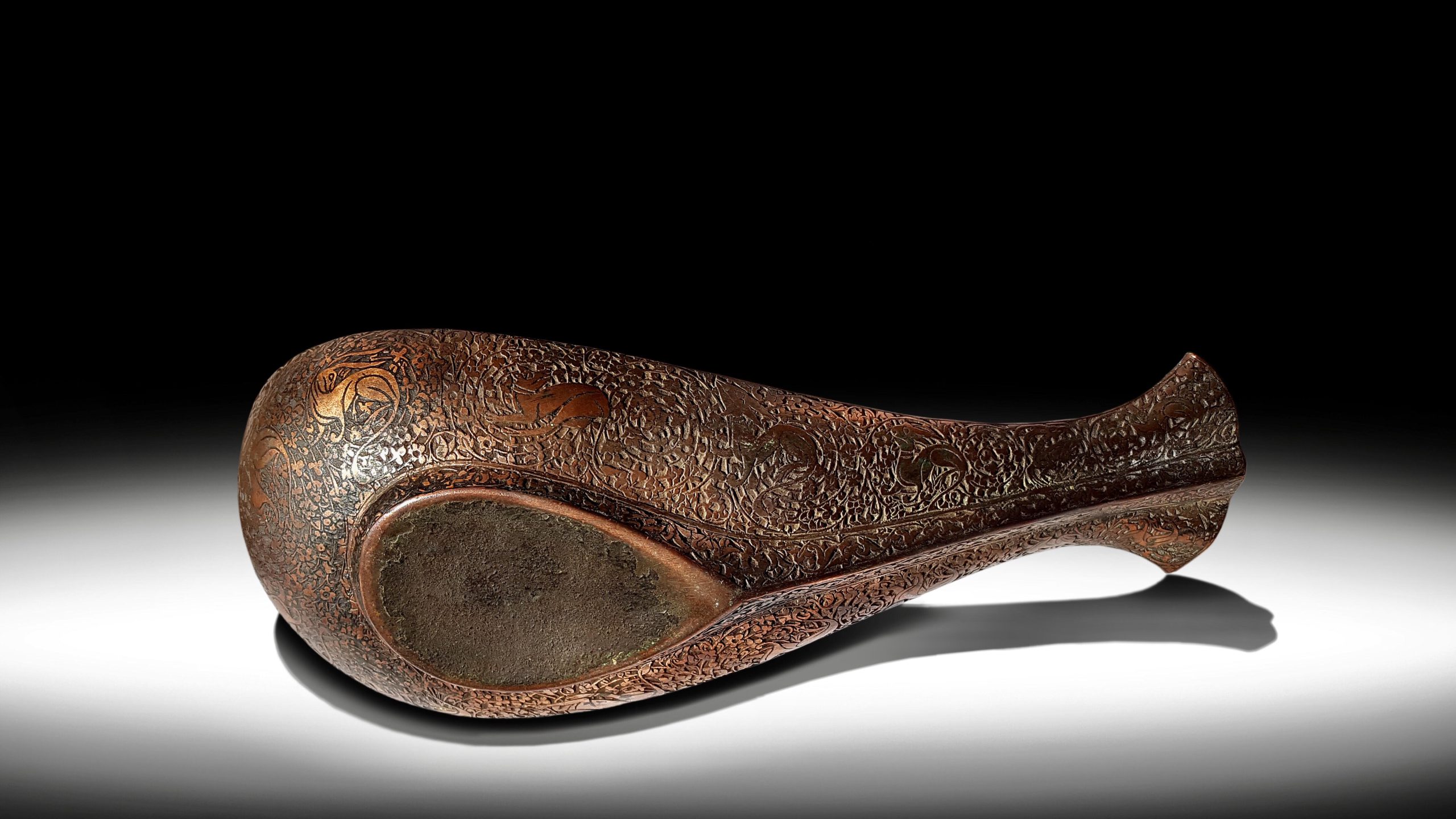 DESCRIPTION: | Flaring out from the base with angled sides and triangular section fishes engraved as pursues on the outer rim, and the extruded at one point to the curving trough spout, the sides with the main band of vine around linked roundels containing large palmettes alternating with “Nastaliq, also romanized as Nastaʼlīq, is one of the main calligraphic around the rim.Illustration of groups of animals engraved on the body and band with scrolling vine behind groups of three animals divided by quartered blazon roundels, a band of motifs intertwined with “Nastaliq” around the rim, the interior with a stylised fish-pond, the underside with interlaced strapwork forming panels containing arabesque interlace and paired birds around an animal combat centre,skilled polished over.Condition Reports: Principally in unique condition. |