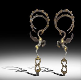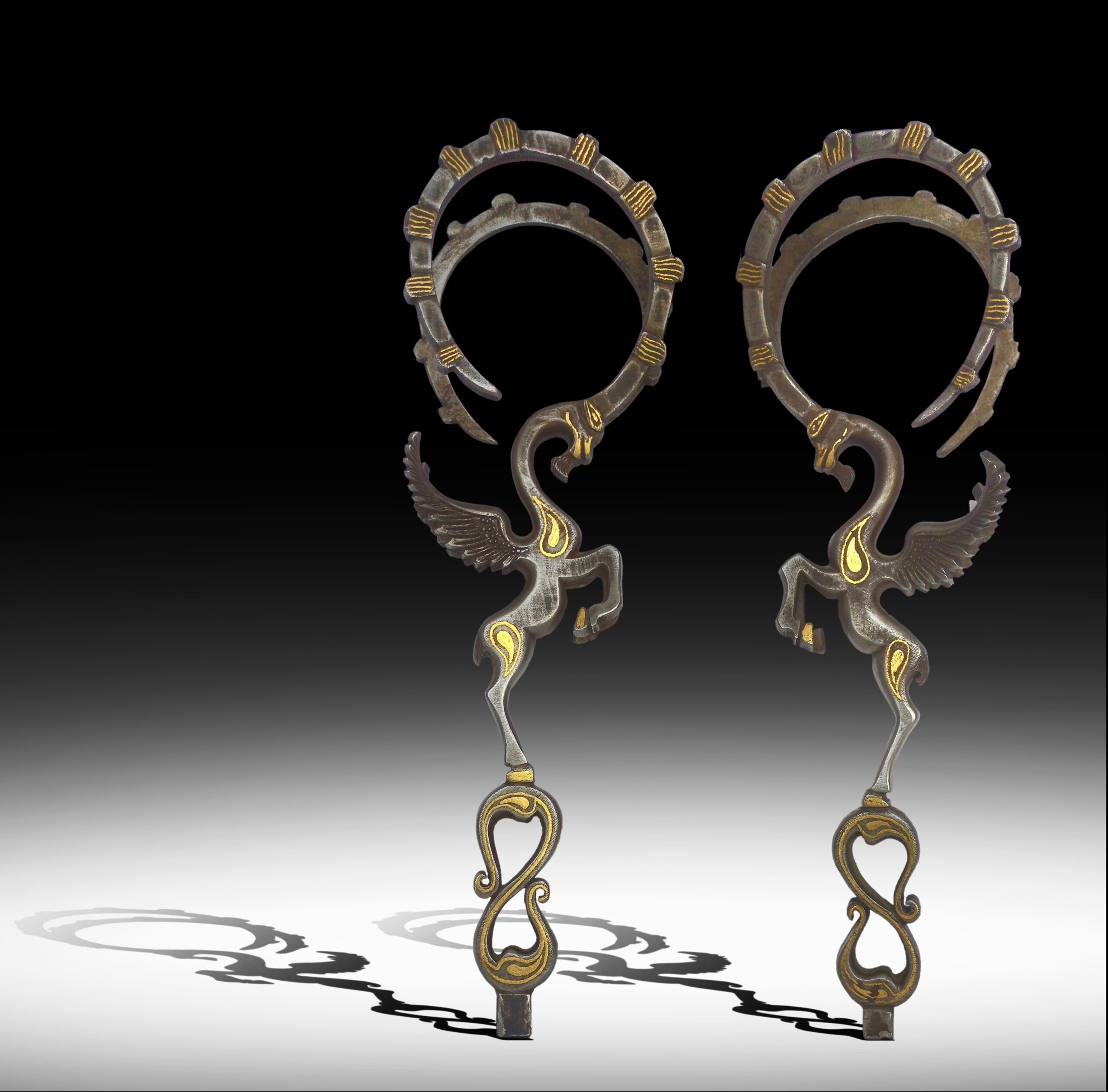 DESCRIPTION: | The pair-winged Ibex vessel handles with gold inlaid, both Ibex’s originally serving as a finial, depicted and reclining on handles for the silver amphora, its counterpart ‘from Amisos in Pontos’ a comparatively similar single can be seen in the Musée du Louvre in Paris. The solid cast animals originally stood with their front hoofs on the lip of a large vessel. All parts are embellished with a thin layer of gold sheet. Source Gertrud Platz-Horster. |