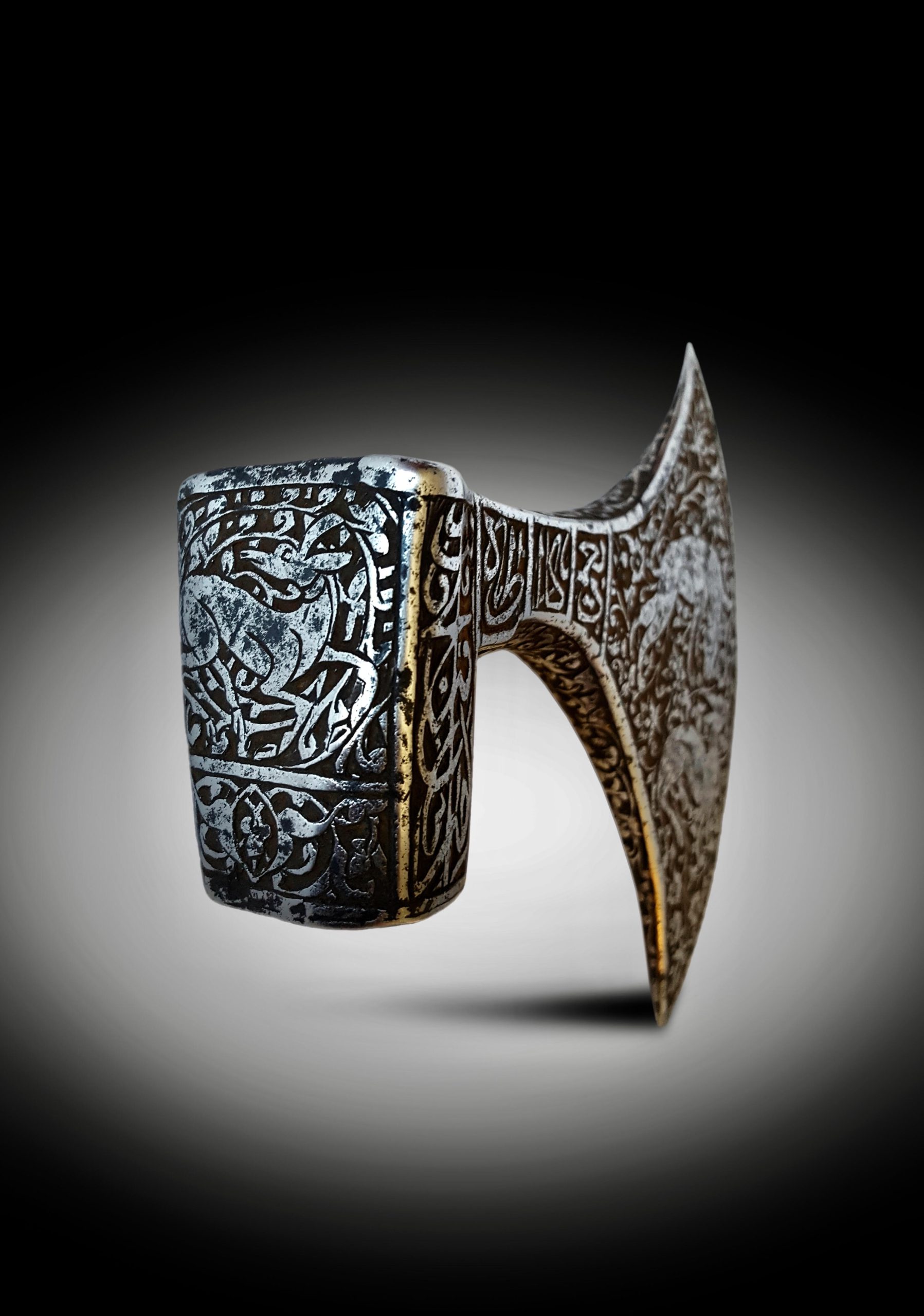 DESCRIPTION: | In the span of the Safavid era, metalwork was at its pinnacle time, such as this exquisite steel Axe head with an exclusive and intensely carved double-sided blade and handle encircled with a Quranic inscription. |