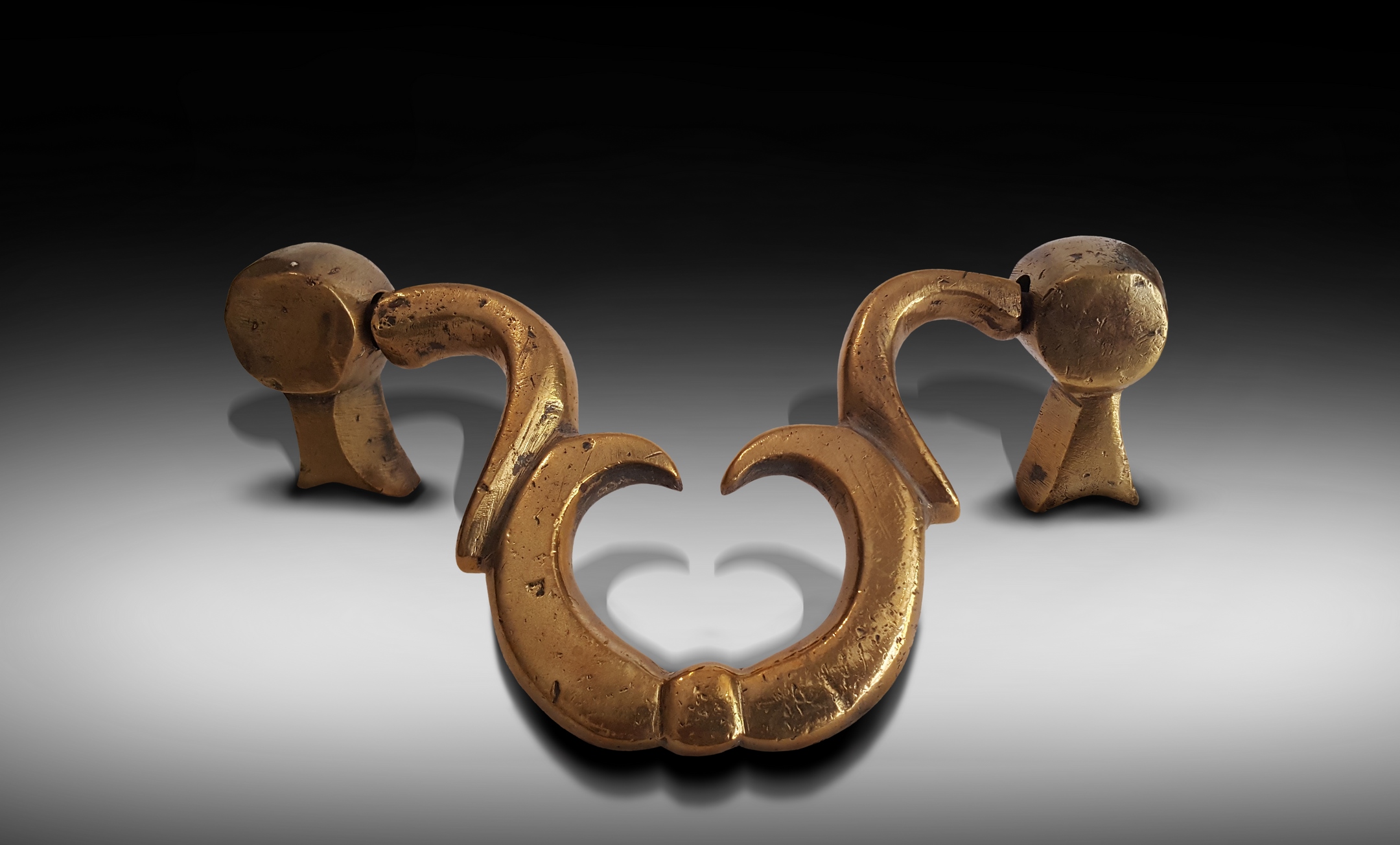 DESCRIPTION: | The door-knocker openwork brass in the form of an open cranium turban which was formed in a Ayyubid era with each flank bound into the arches shape pits. |