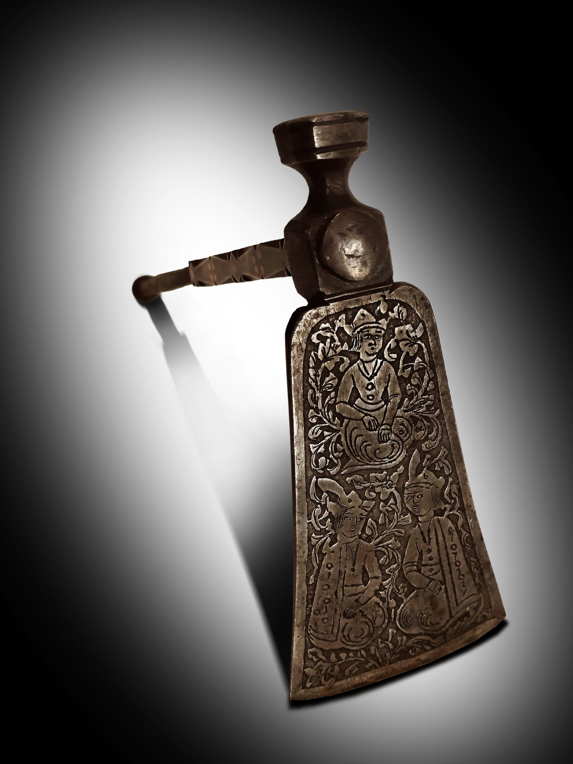 DESCRIPTION: | Comprising of an octagonal shaft and a dedicated blade with the fully engrved with beautiful “Safavid seated figurines characters mingled each other and reciprocal trefoil motifs above the reverse with an octagonal hammerhead, the with hand craved corners on each side and the upper shaft with five elaborate carved blocks with brass pins inlaid designs and stylised the blade mounted perpendicular to the shaft in the centre with a panel of arabesque interlace “Safavid figurines mingled with motives With the upper surface engraved with Further motifs, amplest on the panel, the reverse with an octagonal hammer-head, overall,slight oxidation, surface cleaned. |