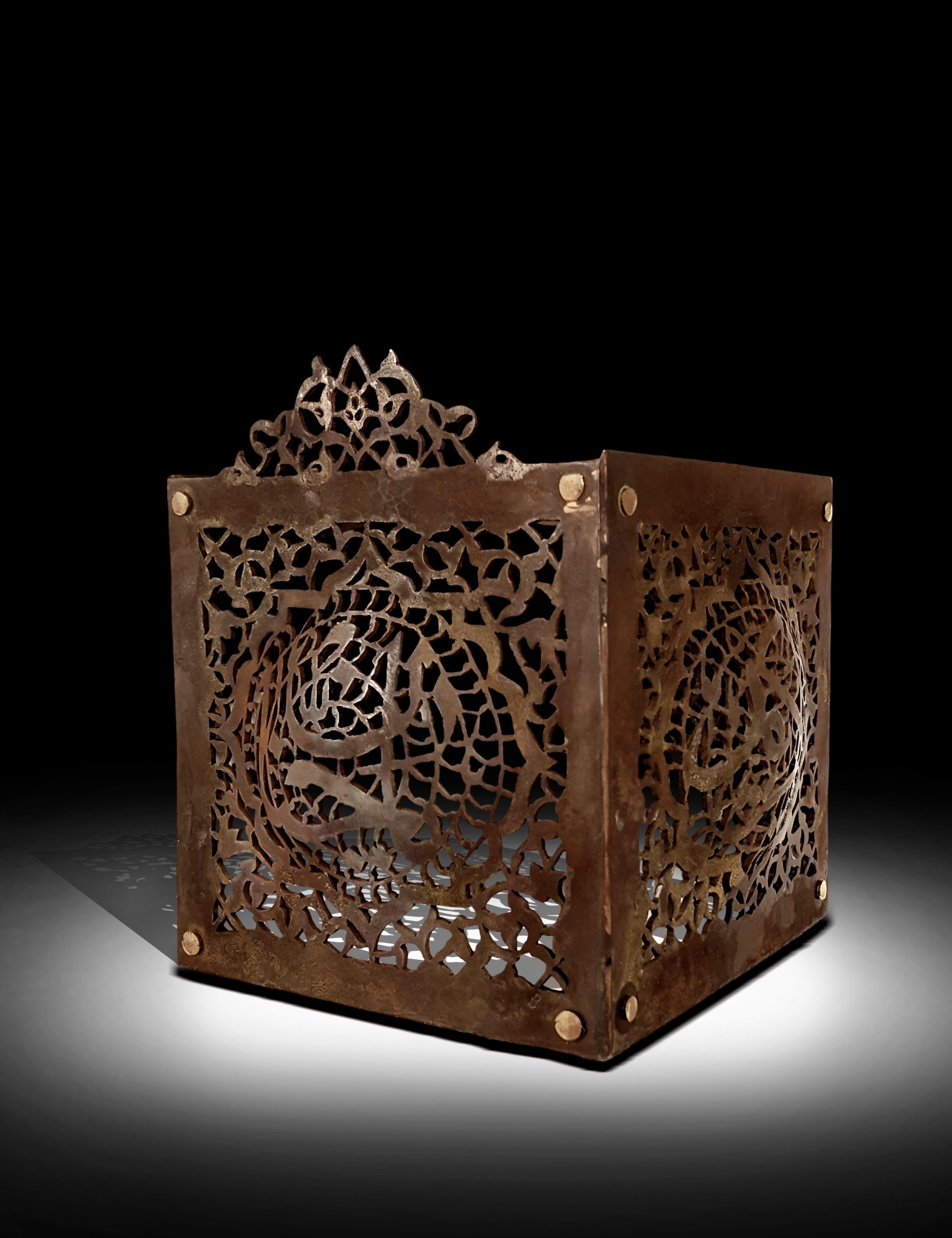 DESCRIPTION: | Of square form with bevelled top, each side with openwork decoration with calligraphic panel inscribed (Ya Hyaena )O on floral scrolls and bordered with floral arabesques, the corners marked with brass pins finials, the top inscribed in scripts, pierced at top and bottom to fit on the original ‘alam shaft. |