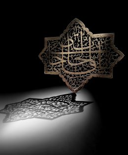 DESCRIPTION: | The drop-shaped panel with the Islamic star shaped pendant each enclosed within a later frame, each with finely worked cut steel spiralling tendrils issuing palmettos and flower heads around a bold inscription, small area of restoration. |