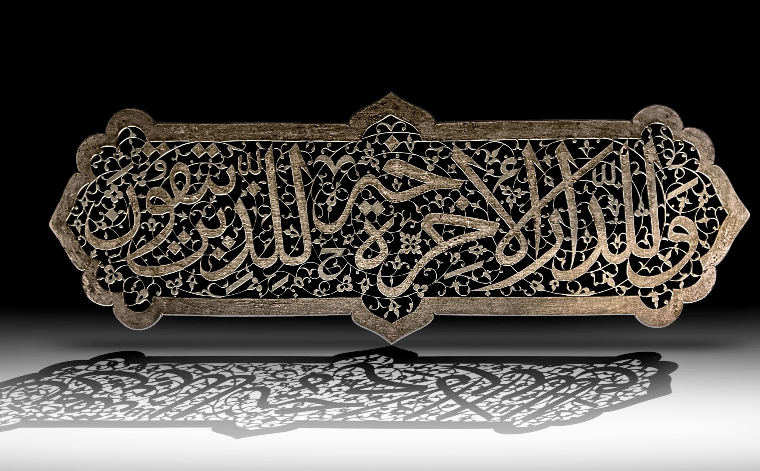 The cartouche is rectangular with cusped ends and a small arch at the Centre of each horizontal edge, the body with extremely elegant and bold calligraphy against a background of finely worked cut steel spiraling tendrils issuing palmettes, crammed with the interfaces arabesques and leaves and flowerheads, surface slightly over-cleaned as viewed.