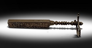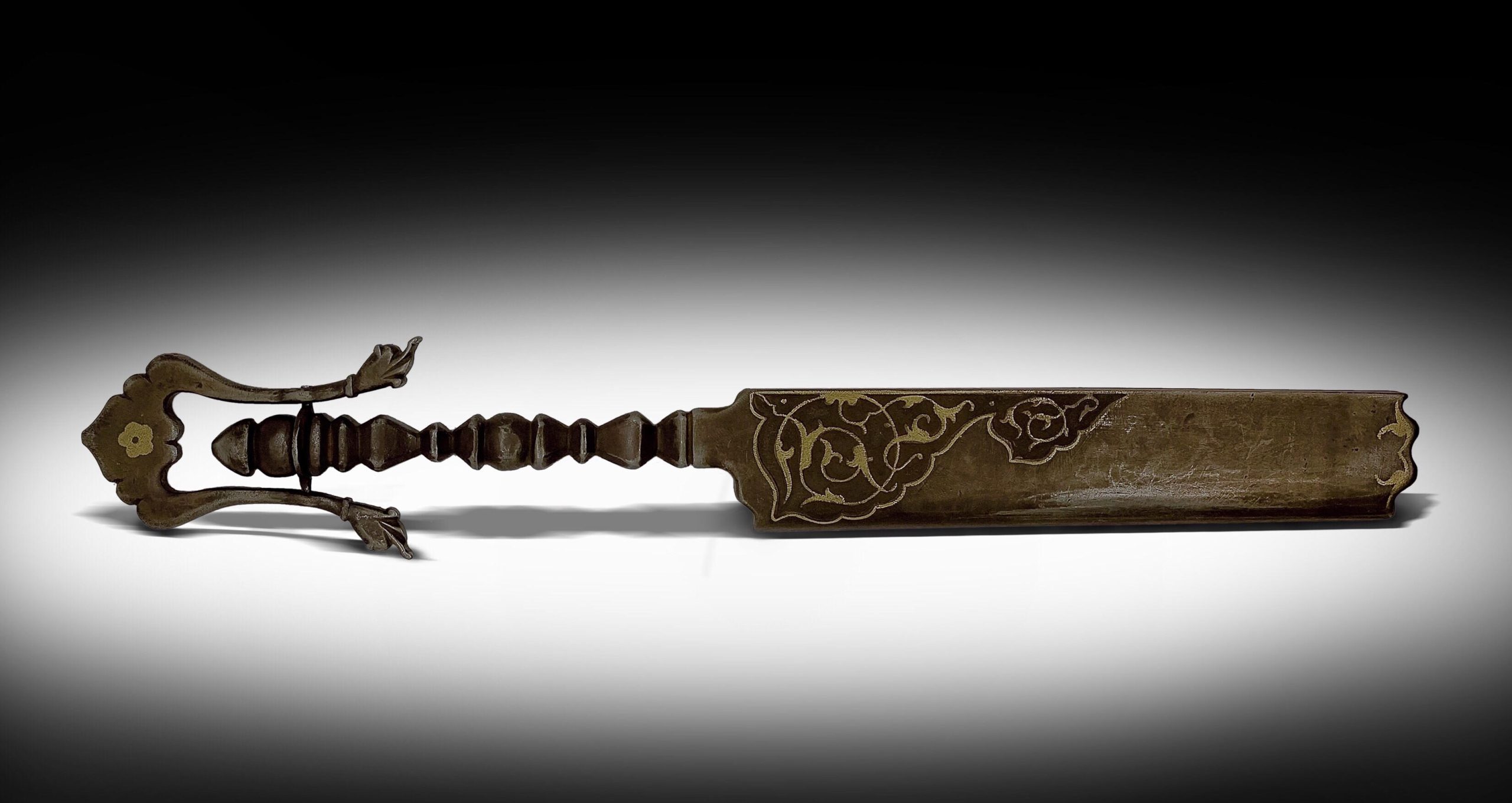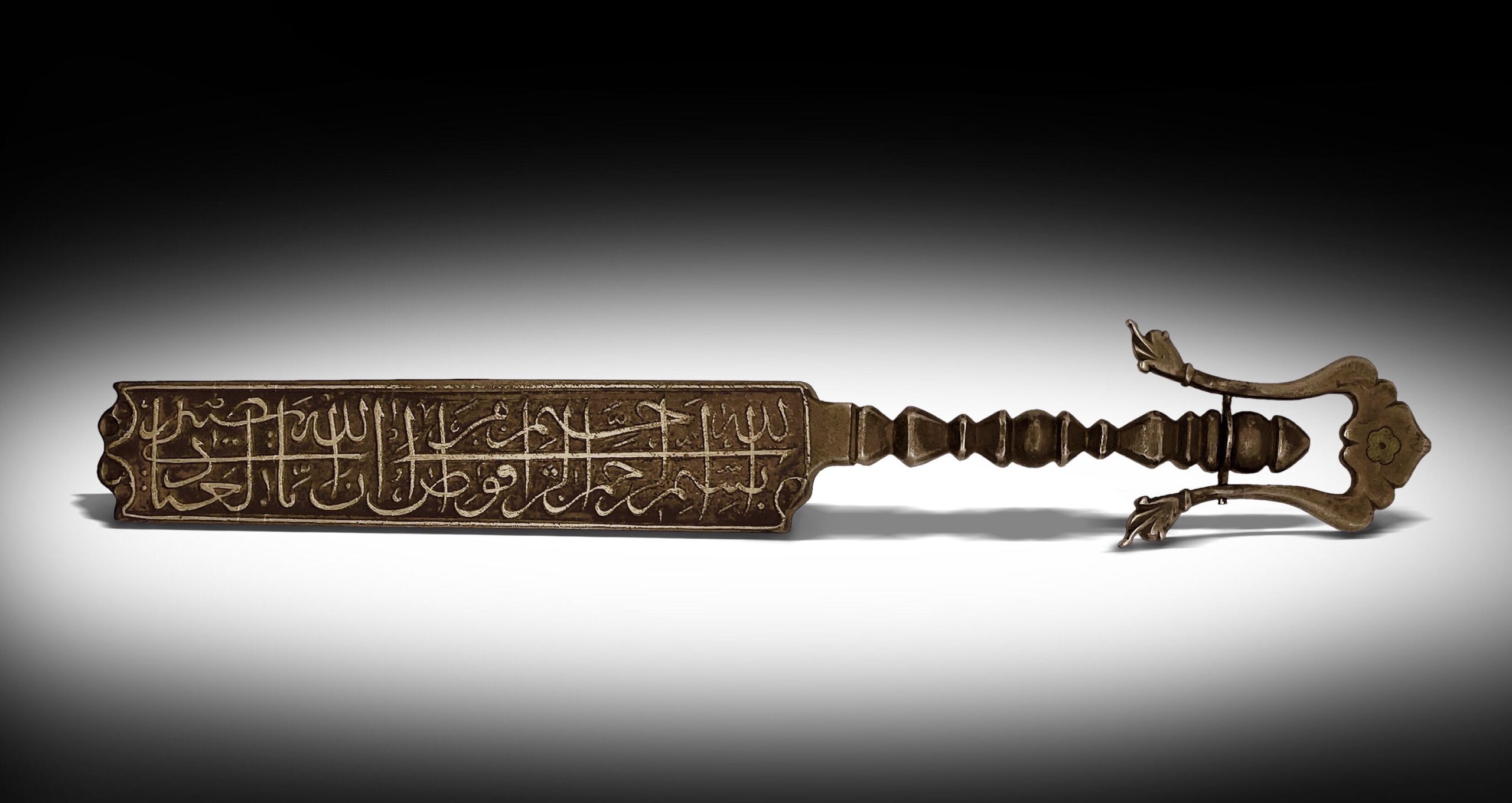 | 44 of Surah Ghafir. So you will remember what I say to you, and I entrust my affair to God, for God sees the servants Verse 44 of Surah Ghafir.This is an extremely elegant example of the shape. The interlaced arabesques on the handle are, in particular, beautifully handled. A later example is in the Parviz Tanavoli Collections. James W. Allan, Persian Steel, Oxford, 2000, no.I,3, pp.328 and 330). The note to that entry gives details of two other examples. One is signed by Khura and is in the Benaki Museum; the other is signed by Rafi’ al-Din Muhammad, formerly in the Harari Collections. |