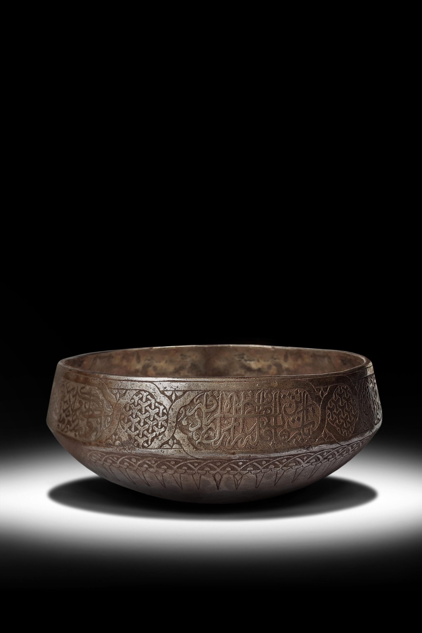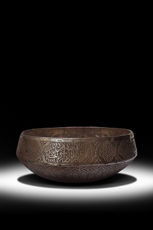 DESCRIPTION: | Of squat form with rounded base and inverted rim, the exterior engraved with a broad band of “Quranic inscriptions interchanging engraved with Jointly knotted “Y” Islamic geometrical patterns filled roundels, a band above and below of strips lines headed.Condition Reports: The bowl retains a very elegant aged patina. The engraved decoration is still crisp and the “Qur’anic” inscription with “Y” is vertically Jointly knotted and elegantly engraved in overall sufficient condition. |