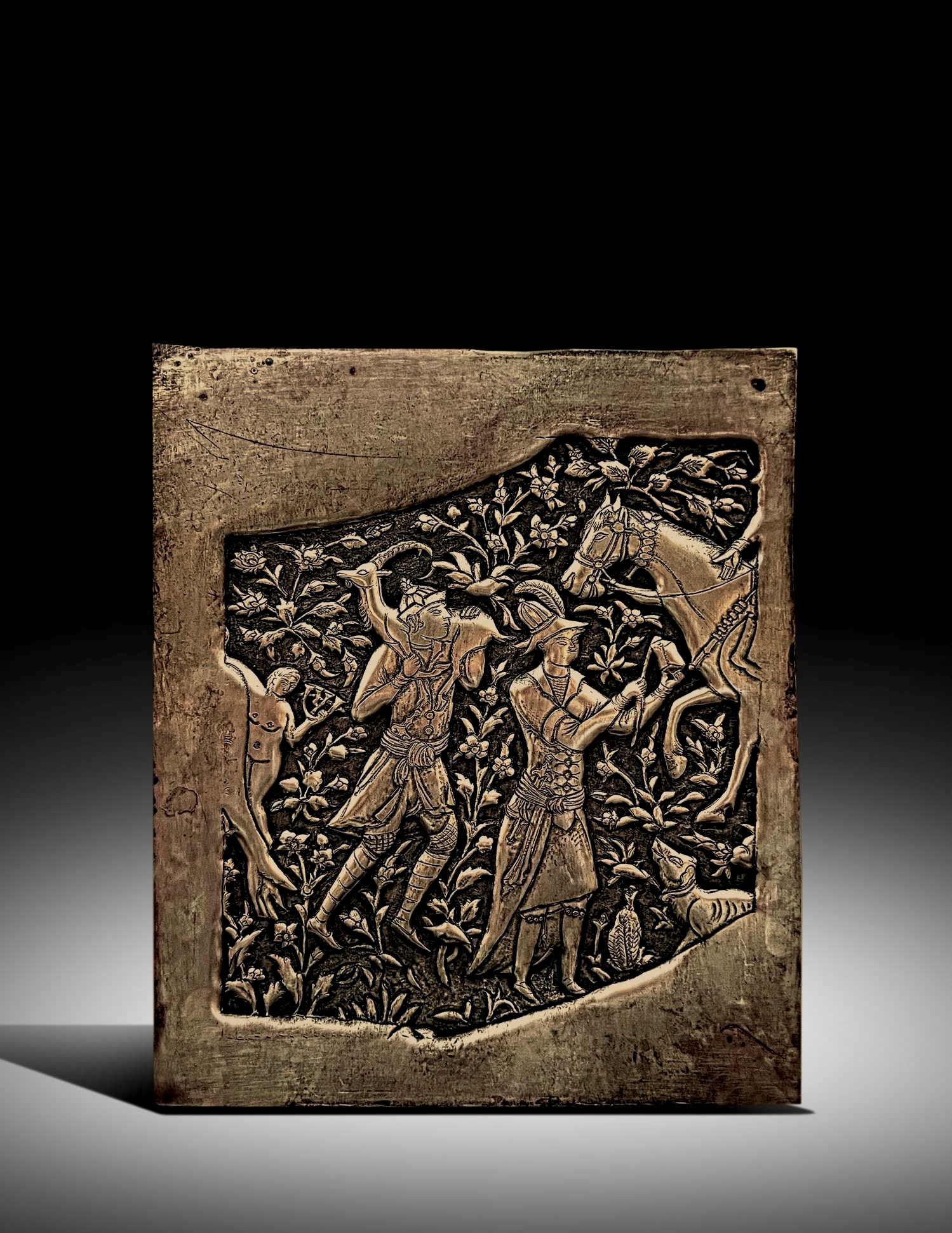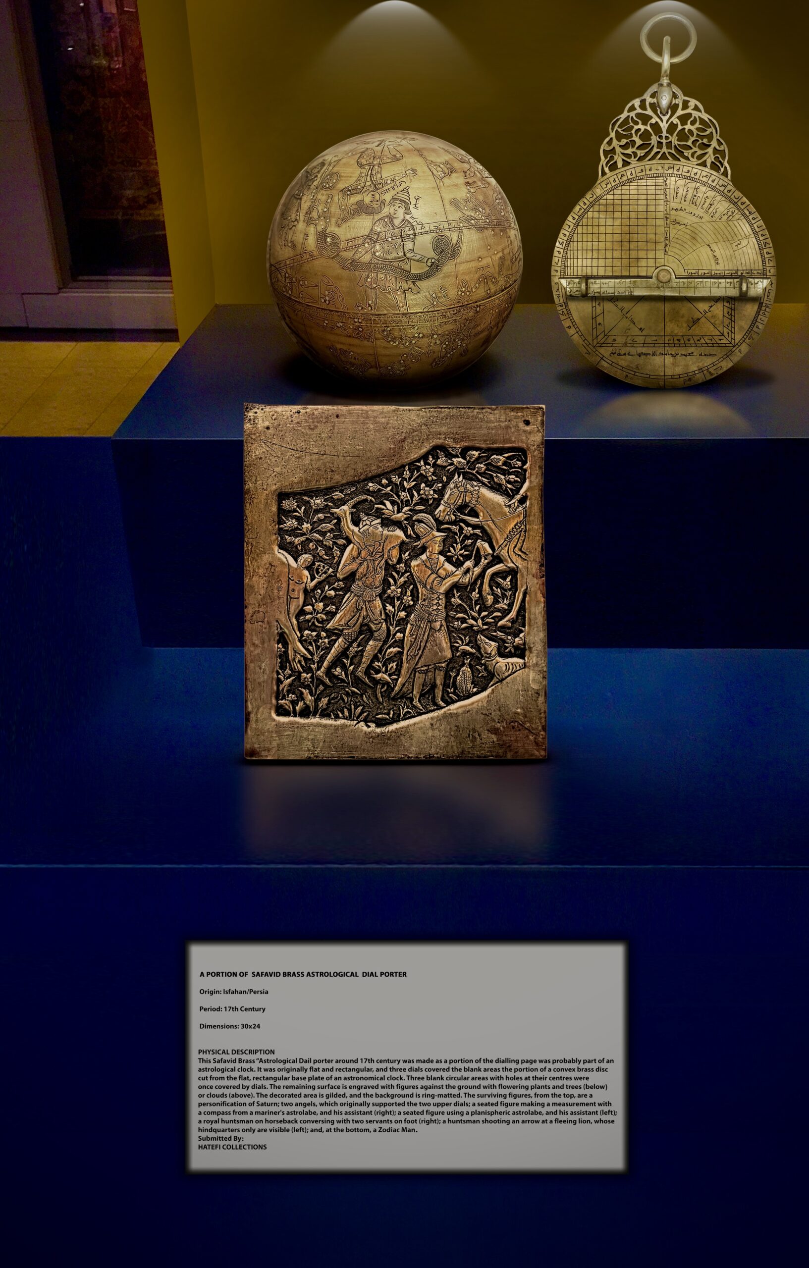 DESCRIPTION: | PHYSICAL DESCRIPTIONThis Safavid Brass “Astrological Dail porter around 17th century was made as a portion of the dialling page was probably part of an astrological clock. It was originally flat and rectangular, and three dials covered the blank areas the portion of a convex brass disc cut from the flat, rectangular base plate of an astronomical clock. Three blank circular areas with holes at their centres were once covered by dials. The remaining surface is engraved with figures against the ground with flowering plants and trees (below) or clouds (above). The decorated area is gilded, and the background is ring-matted. The surviving figures, from the top, are a personification of Saturn; two angels, which originally supported the two upper dials; a seated figure making a measurement with a compass from a mariner’s astrolabe, and his assistant (right); a seated figure using a planispheric astrolabe, and his assistant (left); a royal huntsman on horseback conversing with two servants on foot (right); a huntsman shooting an arrow at a fleeing lion, whose hindquarters only are visible (left); and, at the bottom, a Zodiac Man, This Safavid Brass “Astrological Dail porter around 17th century was made as a portion of the dialling page was probably part of an astrological clock. It was originally flat and rectangular, and three dials covered the blank areas. |