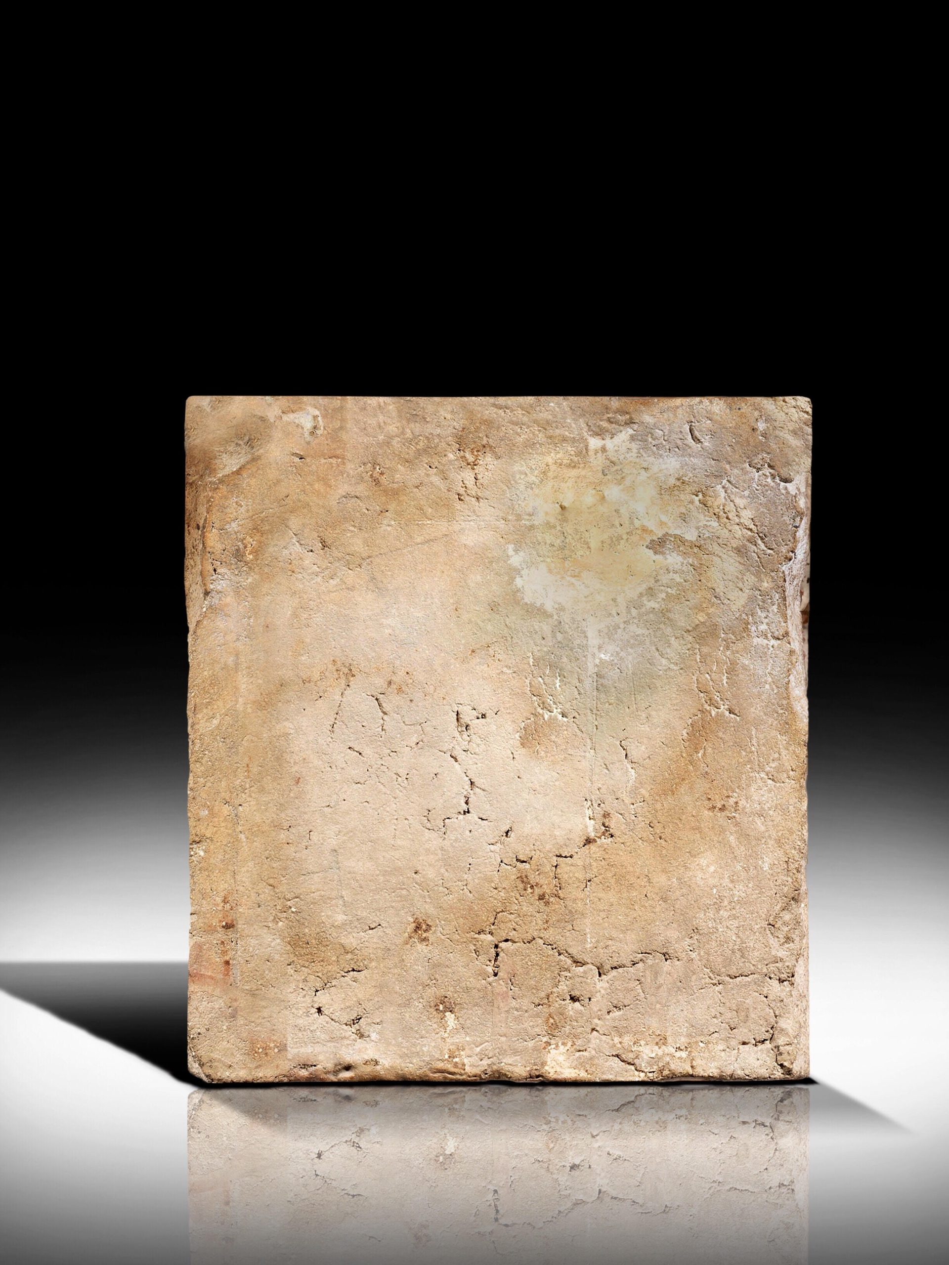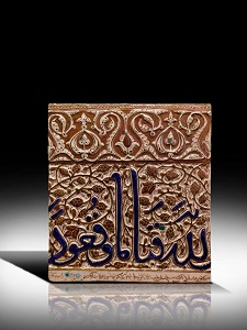 Of rectangular form, the main field moulded with a Persian inscription in large thuluth script highlighted in cobalt-blue, the ground with dense scrolls with trefoils, the upper band with a frieze of mirroring palmettes, a moulded band with small cartouches below, with turquoise highlights.
