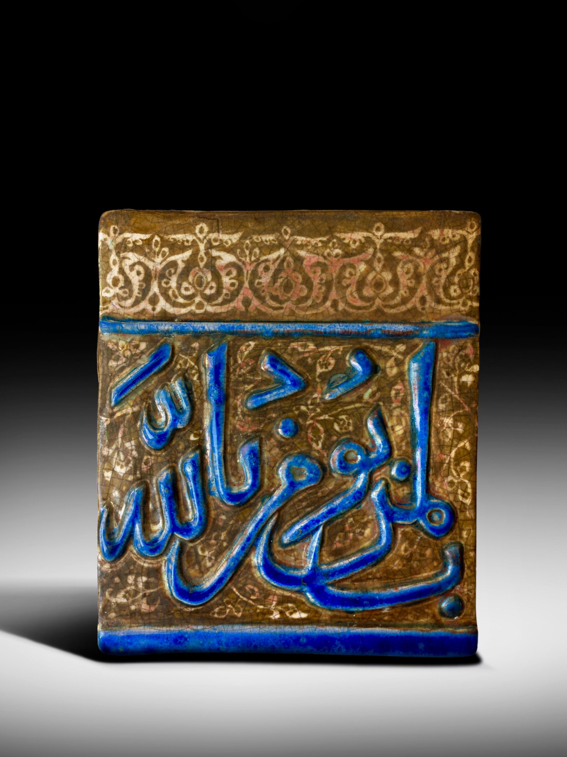 DESCRIPTION: | Of rectangular form, the main field moulded with a Islamic inscription in large thuluth script highlighted in cobalt-blue, the ground with dense scrolls with trefoils, the upper band with a frieze of mirroring palmettes, a moulded band with small cartouches below, with turquoise highlights. |