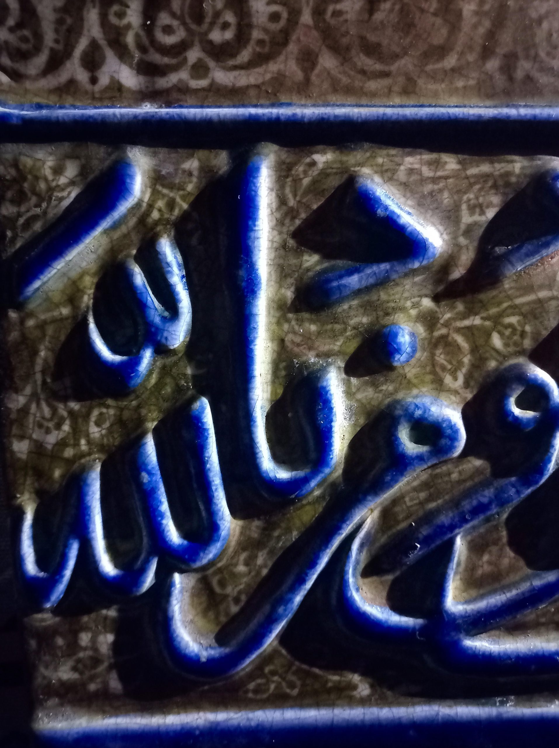 Conditions report: | Overall, the Condition it’s intact, some minor abrasion to raised naskh script with a few small sections with associated restoration and overpainting, and to corners, some hairline cracks to glaze, and a chip visible to the reverse of the top left-hand corner, as viewed. |