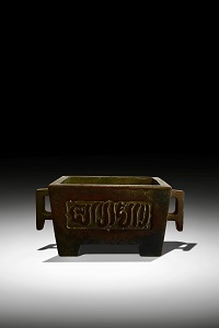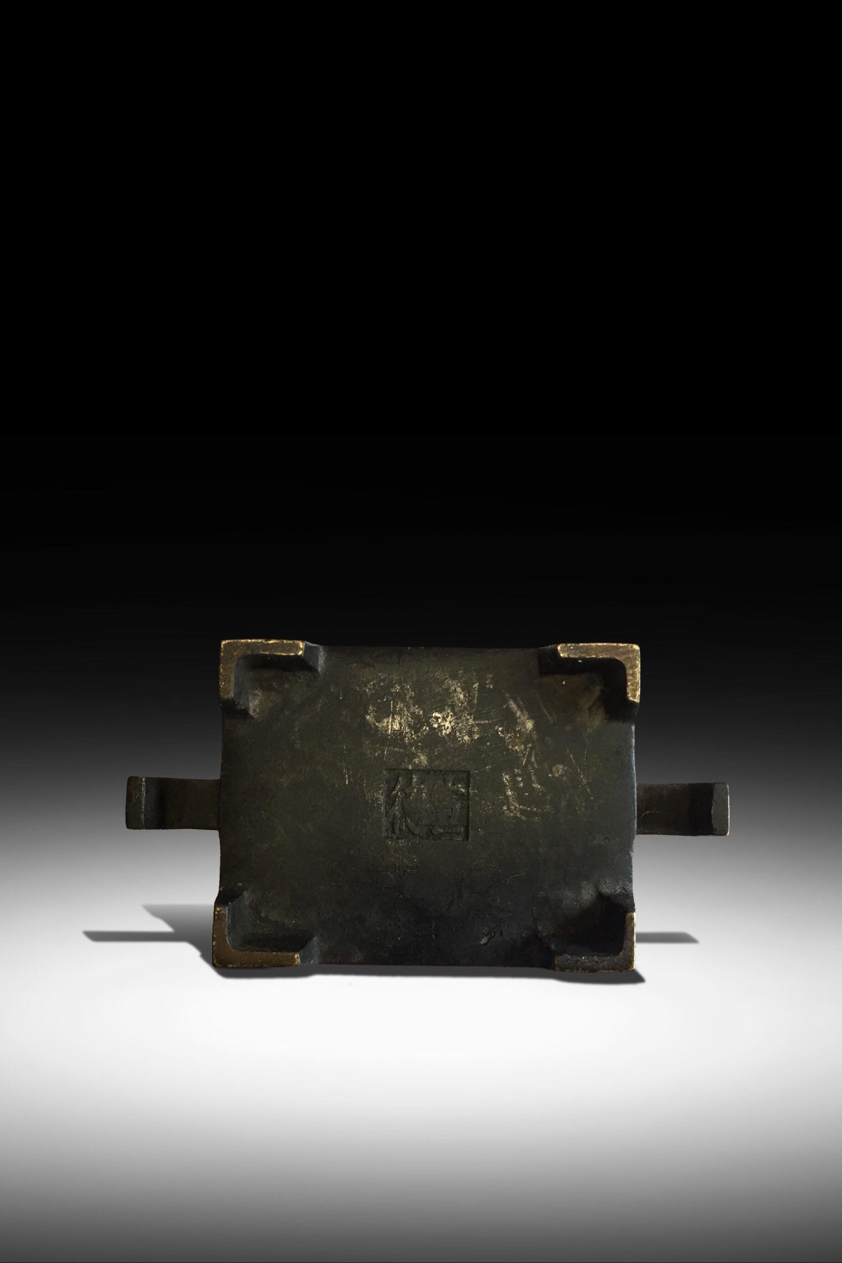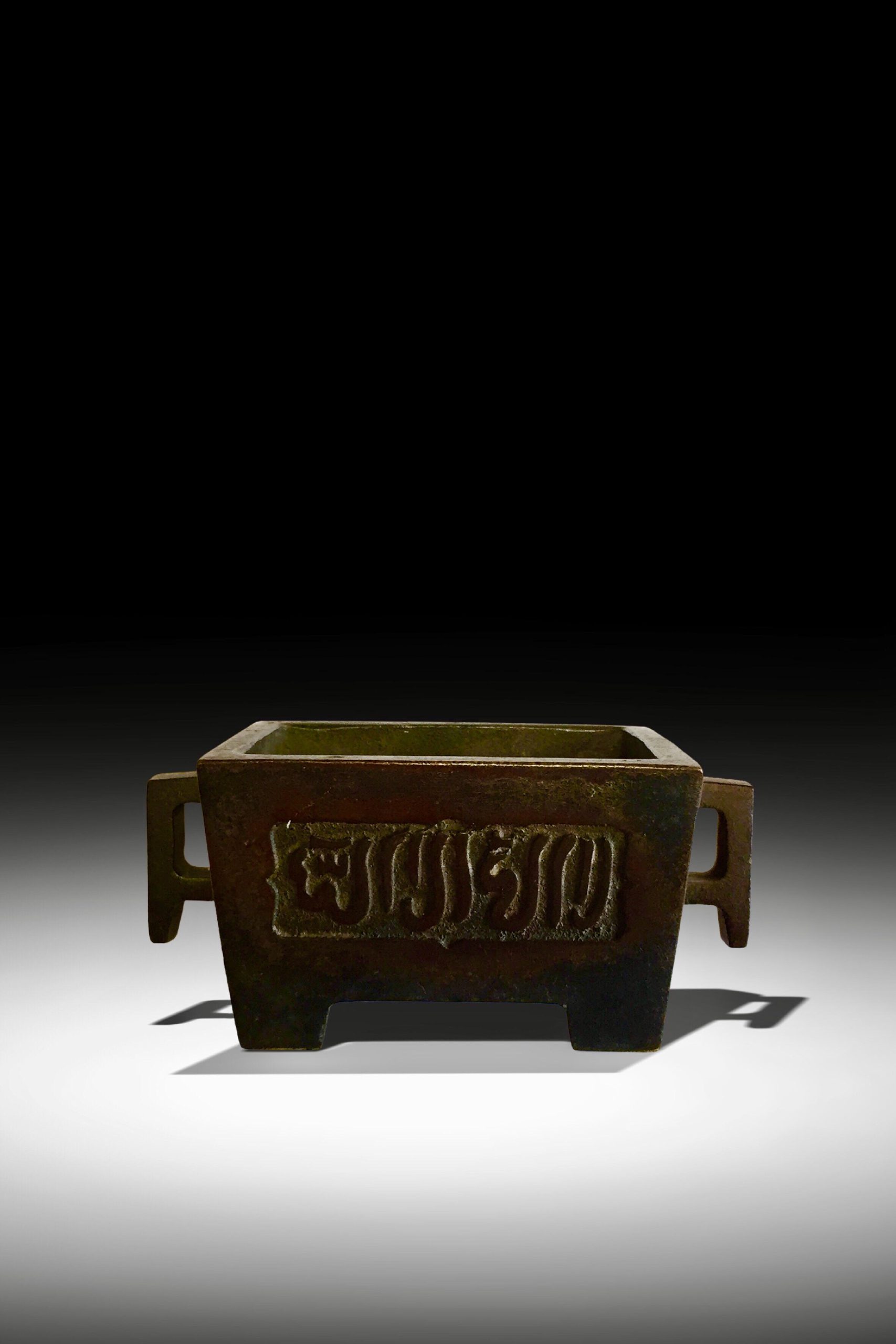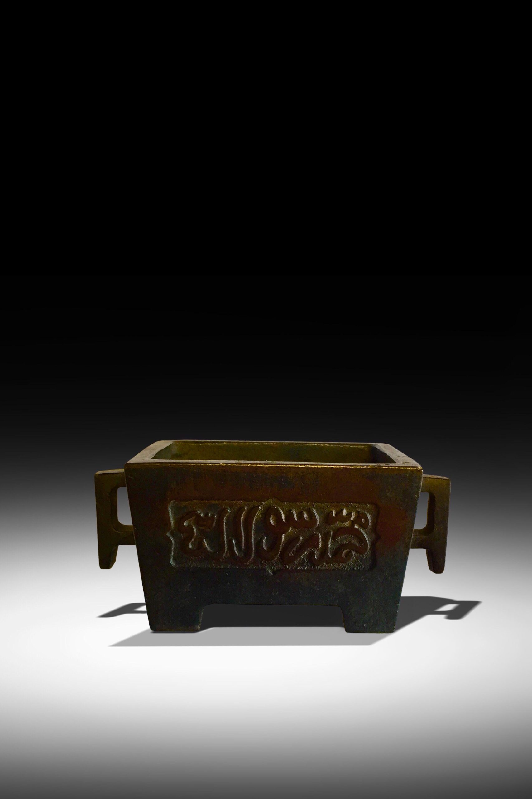 A rectangular shape of a Chinese Islamic incense burner is heavily cast and engraved with Quranic inscriptions on the front and back, a straight sides flaring slightly to the rim, supported on four F-shaped bracket feet and flanked by a pair of ruyi-shaped handles. “RUYI” Known in Chinese “As You Wish” The base is cast with four characters, within a square.