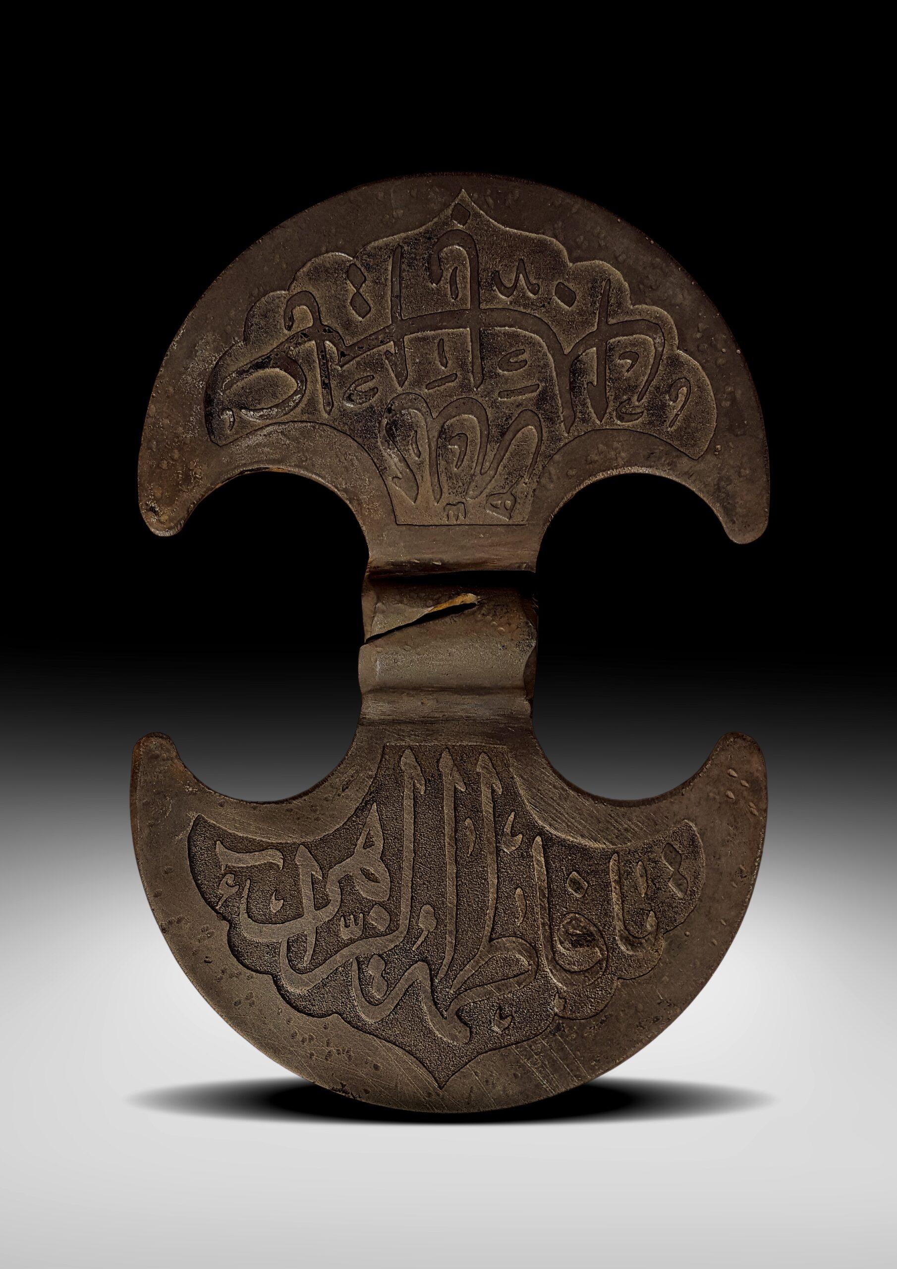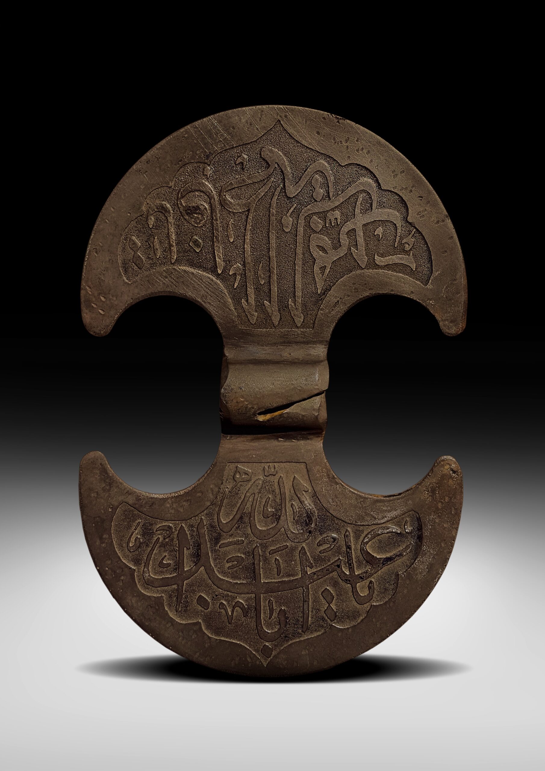With two opposing crescent-shaped blades tapered at the centre leading to a cylindrical, moulded with a single half diagonal grooved attached to the cylindrical in the terminal. The two opposing blades appear In the crescent-shaped with both sides etched inscriptions of (Ya Abu Abdullah), &, (Ya Fatima Al Zahra)
