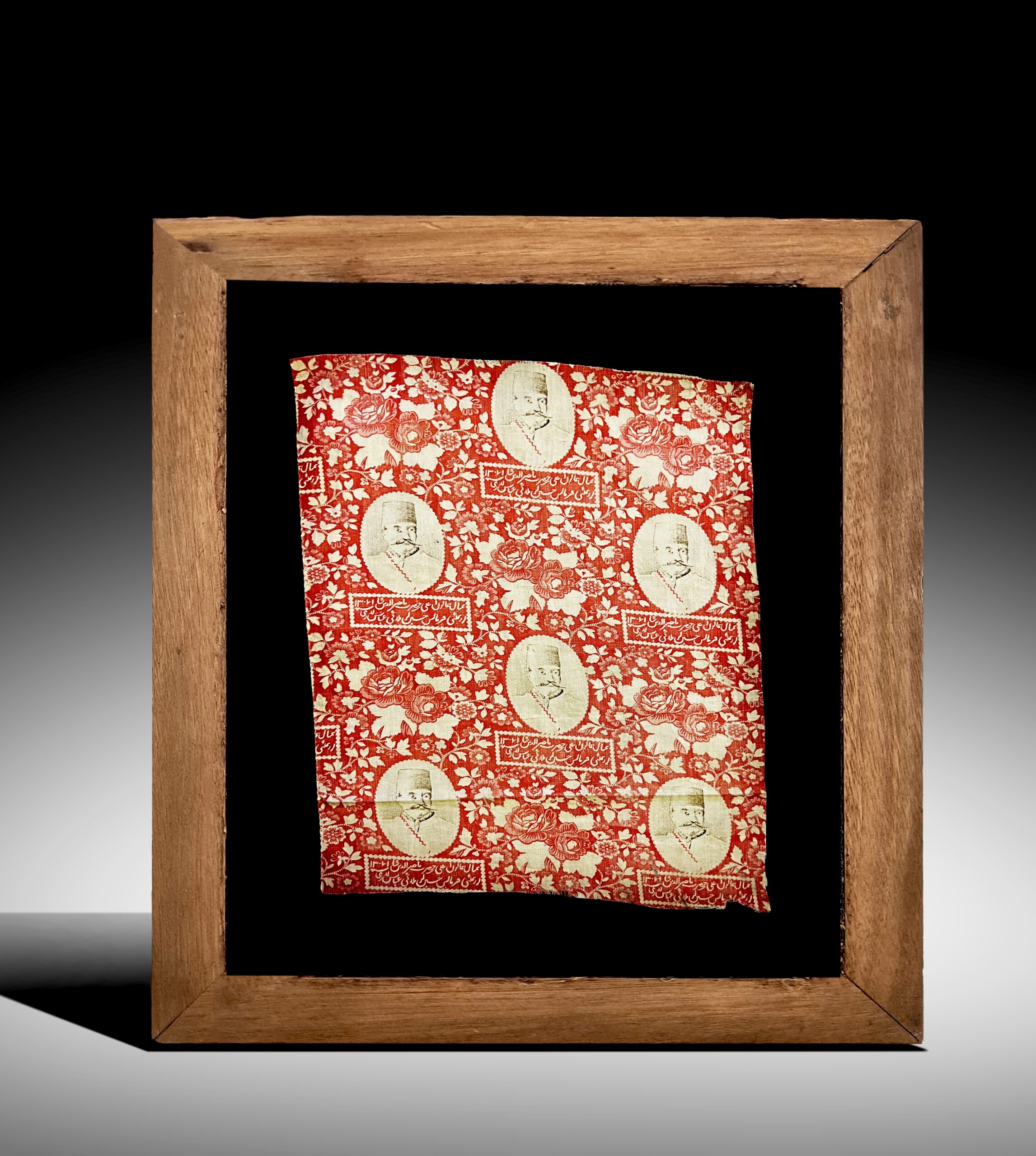 An important Royal qajar hand-made printed on cotton fabric portrait of Nasser Al-Din Shah, uniquely ordered by Hussin Karbalaei and Abbass Badri Dated, Saneh 1307/1890 AD,  On the boundaries and margins malformation comprised of trimming not in the refined cord,  with additional fine delicate red colors hand printed pattern against white background peacefully surrounded by interlace and floral motifs scenes.