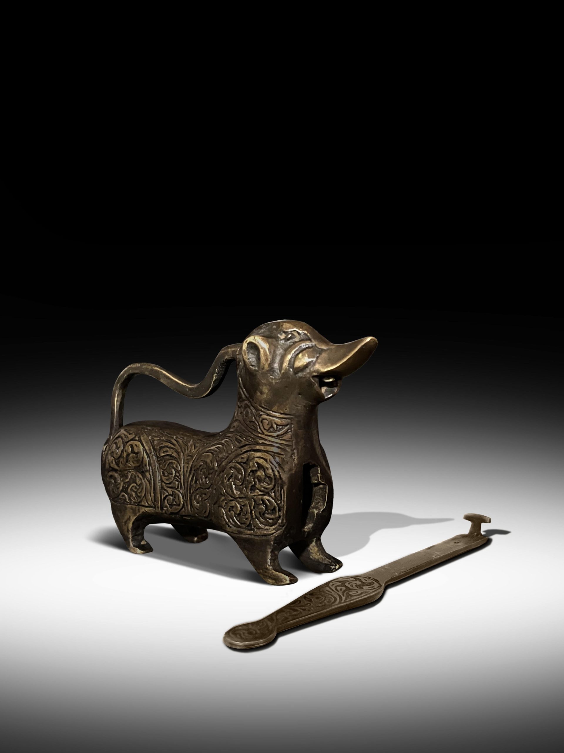 DESCRIPTION: | Of a form an Islamic Pisa griffin bronze lock, with its extremely long body standing with strong posture connoting pride upon all four diminutive legs and looking upward with its endearing face presenting enthusiastic ears, incised wide-open eyes, and a pronounced snout, the an engraved motifs key elongated with welded “T”cropped up.Adding to its appeal, its coat is embellished with incised lines below the collar.The Pisa Griffin is a bronze lock of a said to have known as a gryphon a mythical beast, that has remained in Pisa, Italy since the Middle Ages despite its Islamic origin, specifically 11th century Al-Andalus(Islamic Spain).form of Perfect benediction. |