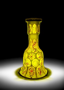 DESCRIPTION: | The royal bohemian lustrous yellow opaque hookah base is hand-painted, with the carved deepened pines and loops and bells shape closed off on the layout. |