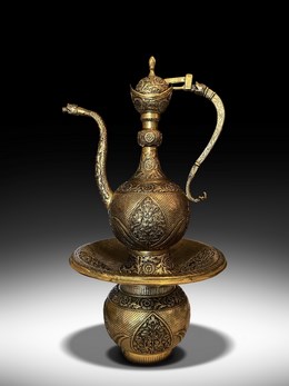 Lot Essay: | A very similar ewer and basin, although with considerably less well preserved gilding, was sold in these Rooms 23 October 2007, lot 116. For a further similar ewer see Sotheby’s London, 18 April 2007, lot 194. There they note another example, although re-gilded, which is on display at the Wallace Collection in London. The form and decoration are based on a very similar form demonstrated by one in the museum of Turkish and Islamic Art, Istanbul (The Anatolian Civilisations exhibition catalogue, Istanbul, 1983, vol.II, no.E.283, p.273), while a further example is in the Ethnological Museum in Berlin (Jens Kröger and Désirée Haider, Islamischer Kunst in berliner Sammlungen, Berlin, 2004, no.59, p.78). Most interesting is an example in Milan where the enamelling on the ewer is applied directly to the body, but that on the basin is in roundels as here. That ewer also bears the crudely engraved ownership tughra of Fatima Sultan Khan and the date AH 1120/1708-9 AD (Museo Poldi Pezzoli, Tessuti-Sculture – Metalli Islamici, Milan, 1987, cat.no.11, pp.279-280 and pls.23-25, pp.302-3). |