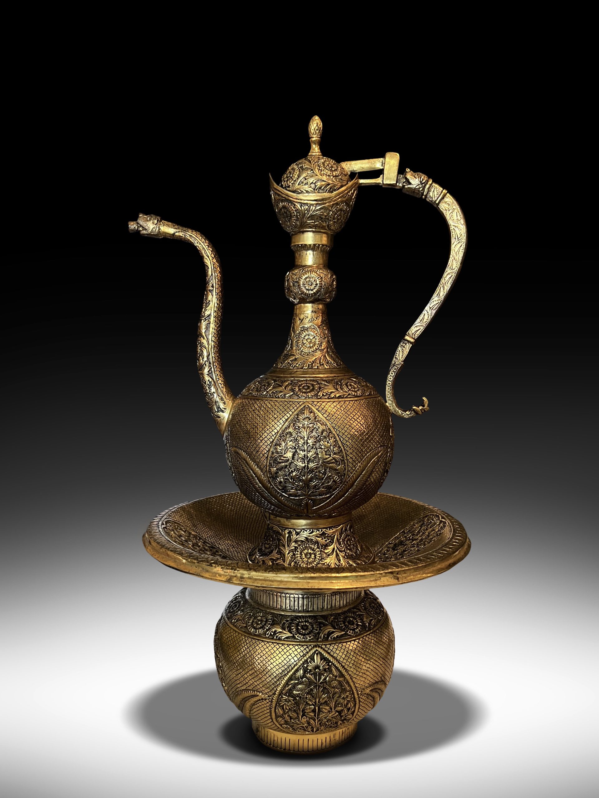 DESCRIPTION: | An exceptional set brass “Tombak ewer with a rounded body, on a short splayed foot, with a slightly waisted neck, slender curving lion spout and applied with the lion open mouth strap handle, exquisite domed lid with knop finial, the body decorated with birds-scale motifs regularly interrupted with roundels and a a couple of birds glimpsing at each other containing reciprocal design, the neck and foot with engraved foliate motif, all with applied circular bosses set with the basin of rounded form with everted rim and separate pierced inner cover with raised stand, the rim with foliate motifs set at regular intervals with bosses, the inner cover similarly set, slight losses of, handle detached at the body. |