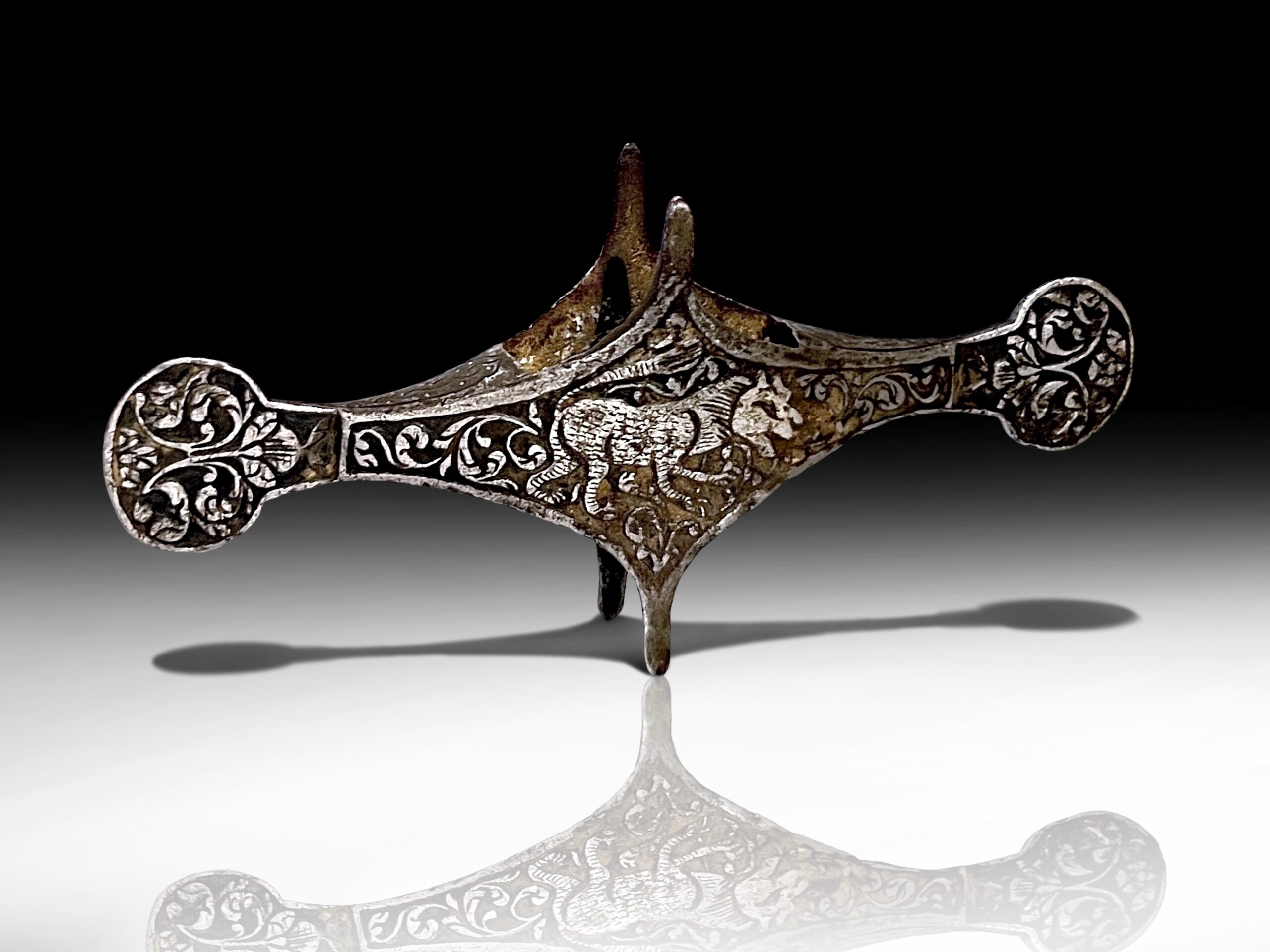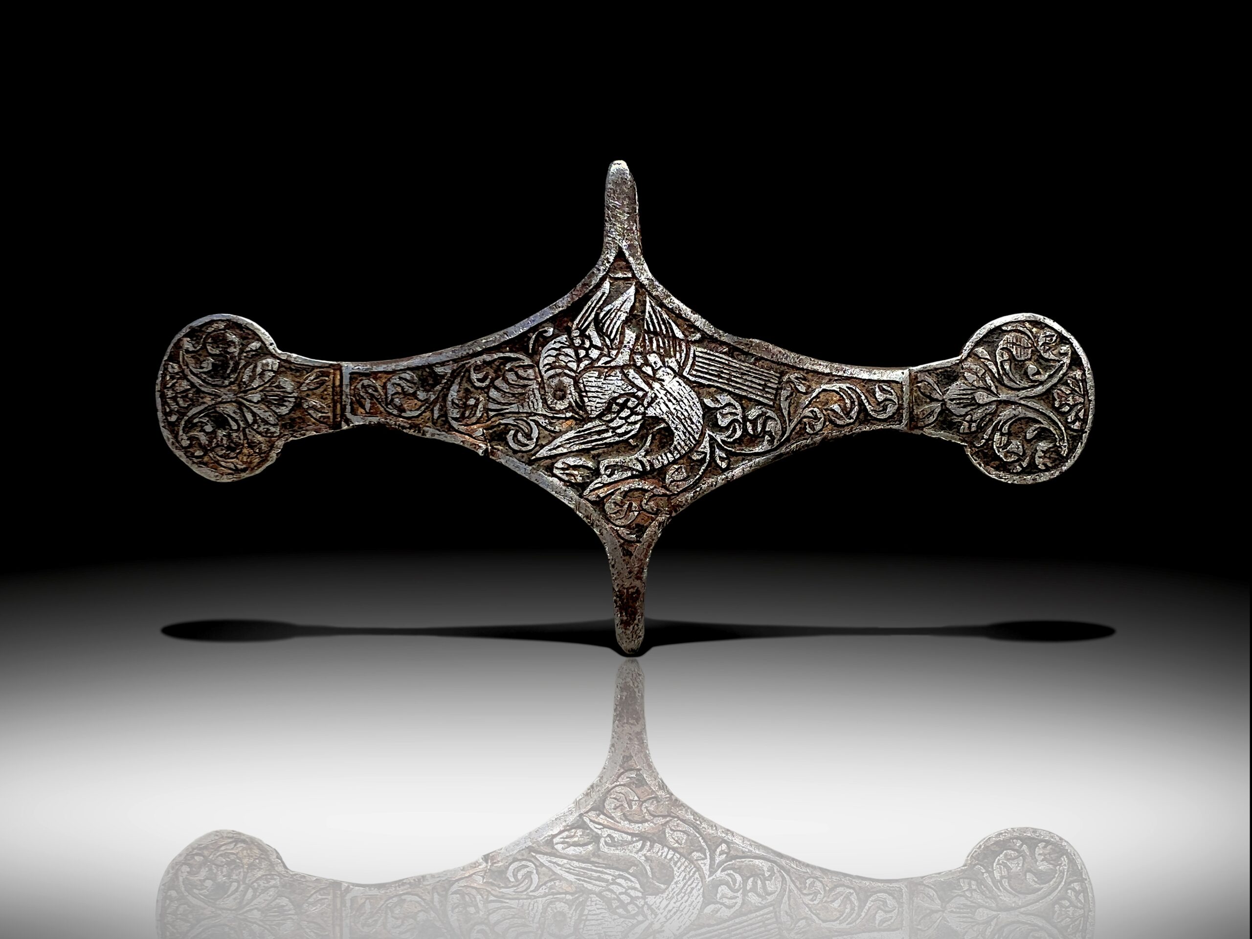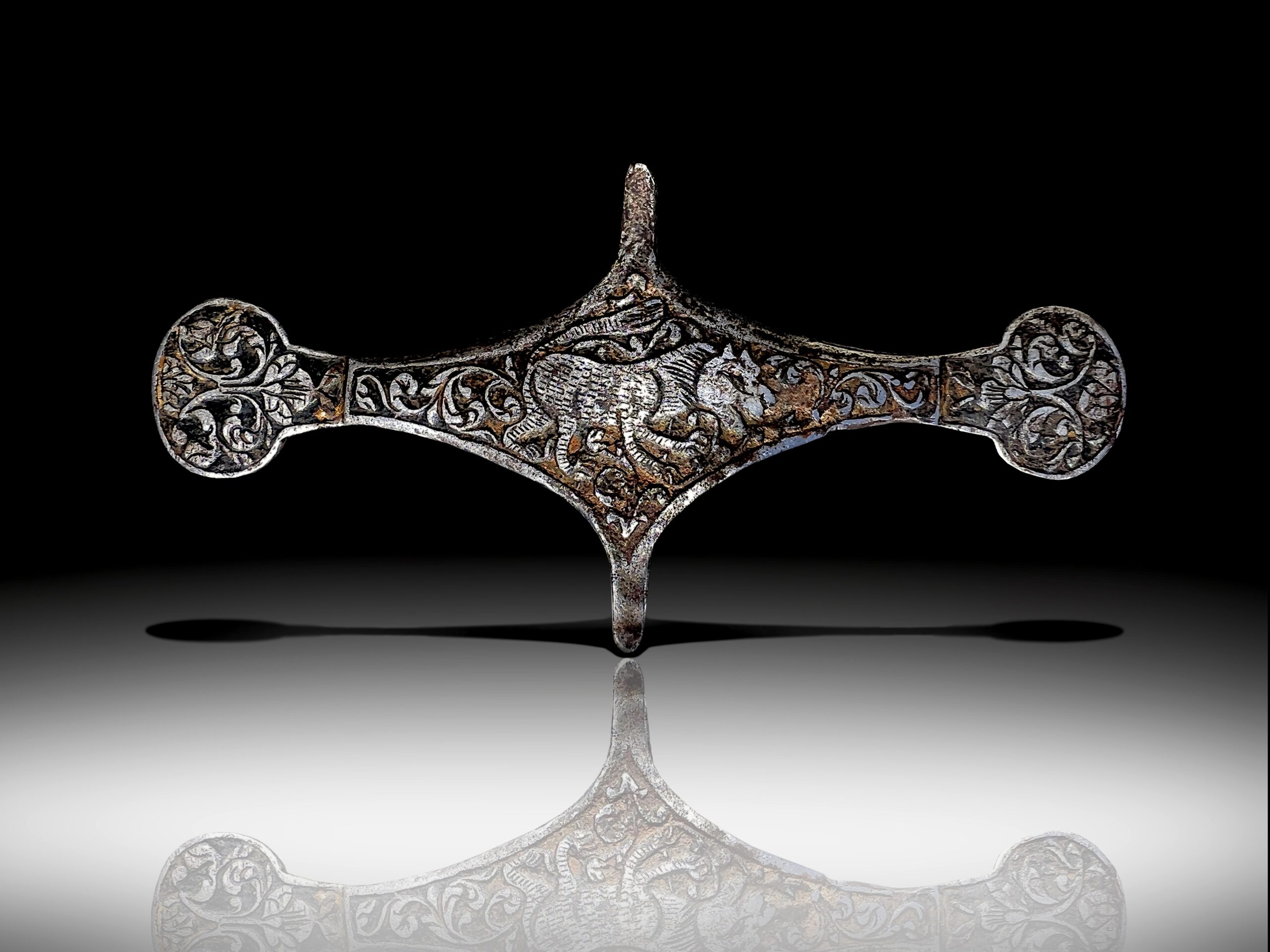 DESCRIPTION: | A Safavid steel cross-guard for sword is deeply carved on either side, with a front flank centerpiece with a famous emblem of the Safavid lion surrounded by motifs and on the other flank, an eagle grasps and poses its talons on Heron’s paunch.This particular Safavid steel cross-guard used for sword belongs to a rare and important group of swords in the period of the late 16th century, each characterized by their profuse use in combination with a Safavid symbol’s and palmettes and arabesques. |