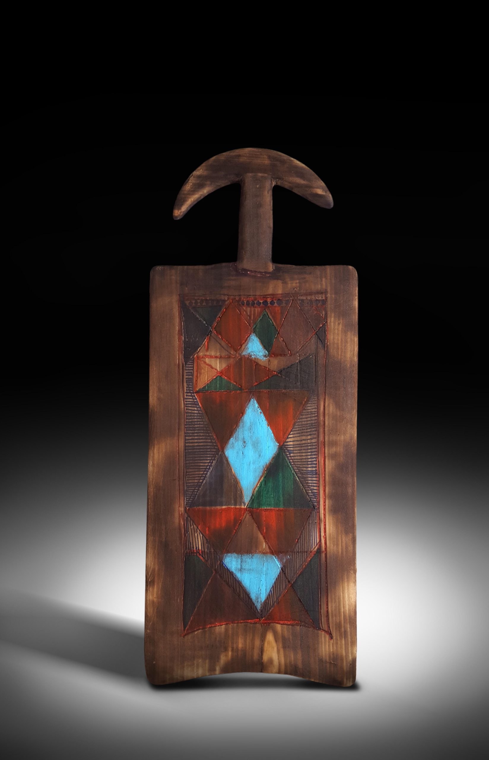 DESCRIPTION: | In a manner shaped crescent moon and pole “Quranic writing board, is the evidence and expression of devotion and discipline, and a connection to an international community connected by Arabic, the language of the Qur’an. In (Timbuktu students) historically used wood writing boards to practice their Arabic calligraphy and to help them memorize Qur’anic verses.Two figures terminally seated by the plant’s logs to extracting the inks from the tree in the method of inscribing on the front of this board is a verse from the Qur’an and the the layout of the local notable camel in Timbuktu. |