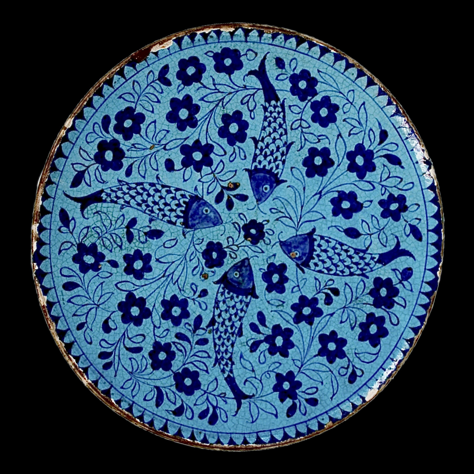 DESCRIPTION: | An old Islamic Persian deep-painted and underglaze ceramic plate, it has a spectacular interior with a captivating spring with the colors of turquoise underglaze swirling four fish spinning and dancing with each other above the profound underwater blossoms known as a Persian pond overgrown. |